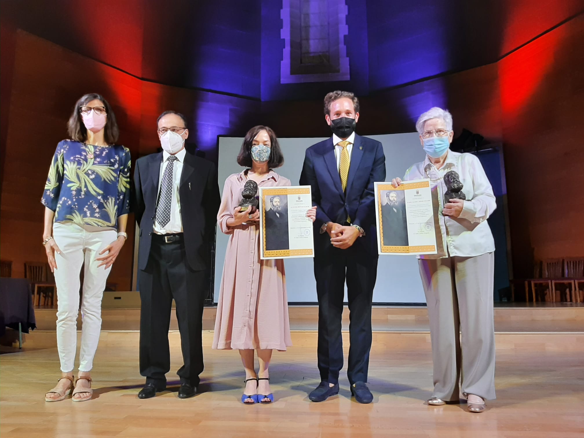 El acalde de Monzón, Isaac Claver, se encargaba de la entrega del otro galardón en materia educativa-cultural a María Gloria Medrano, que estuvo acompañada por sus hijos Nuria y Javier Tebas y varios nietos. Así como algunos ex alumnos que habían querido acercarse al auditorio para felicitar y acompañar a la galardonada.