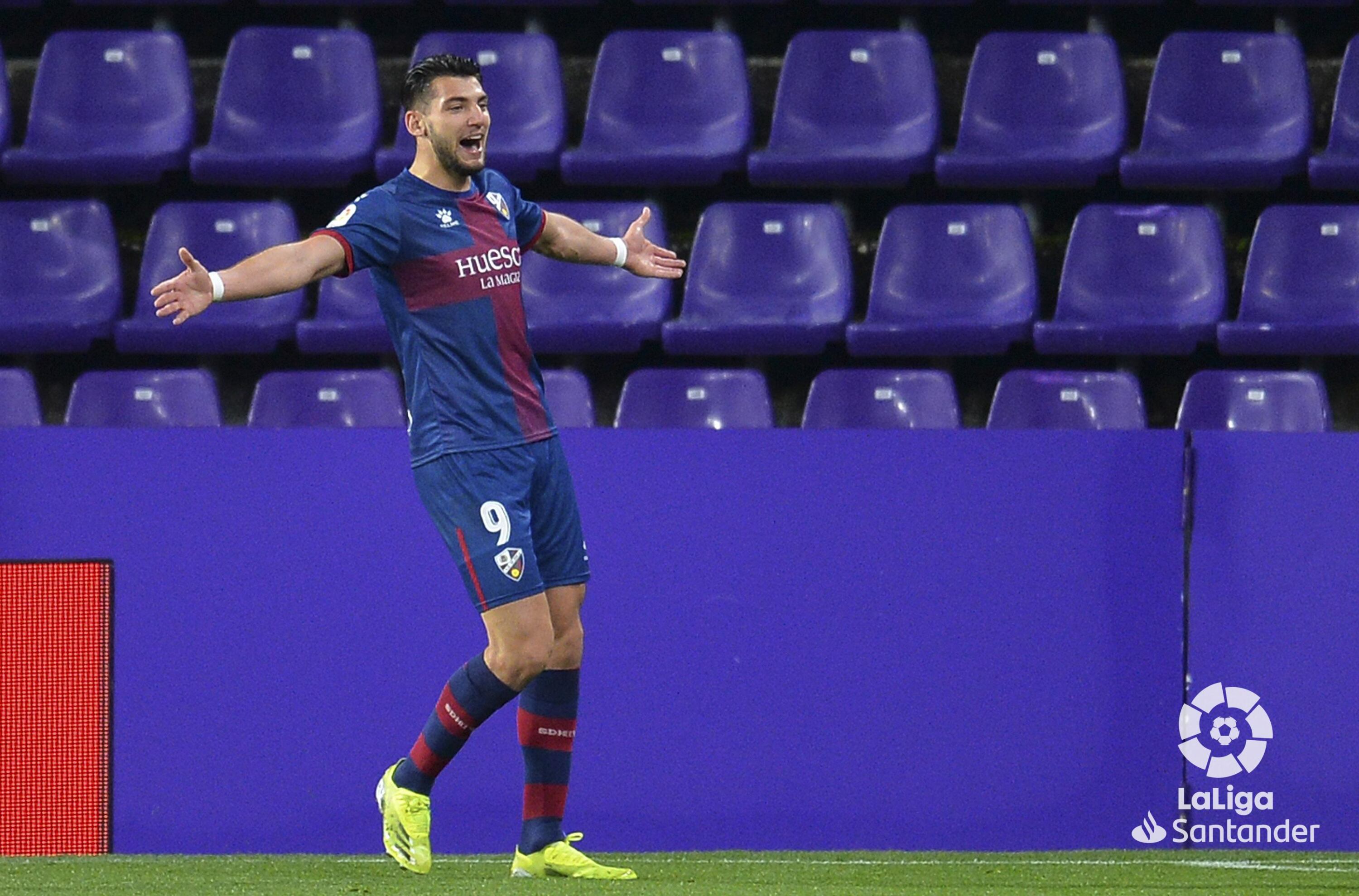 El delantero del Huesca Rafa Mir fue protagonista al marcar los tres goles del triunfo ante el Valladolid