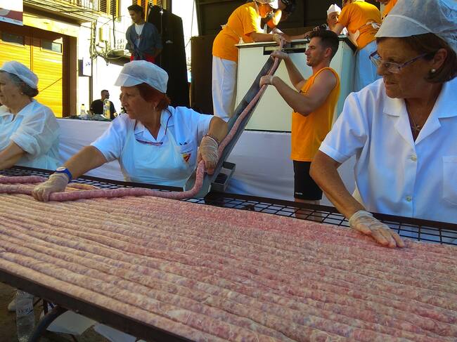 A las 17.30 horas comenzaba, en la calle Barranco, el embutido de más de 1.000 metros de longaniza (unos 1300 kilos de producto), proceso en el que llegan a participar medio centenar de personas, y que se prolongaba algo menos de 3 horas mientras que, los niños disfrutaban realizando las pruebas de la gymkana ‘marrana’ o embutiendo su propia longaniza en el taller infantil.