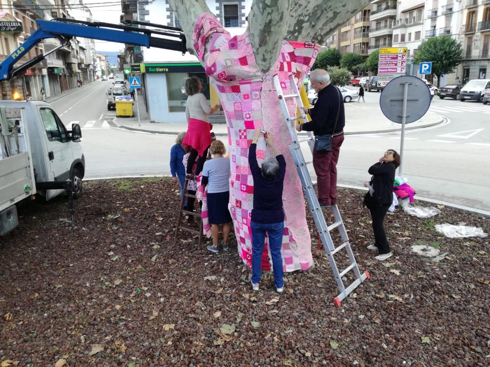 Miembros de la junta local de la AECC en Graus, acompañadas de varios voluntarios comenzaban, este miércoles, a ‘teñir’ de rosa algunos puntos de Graus como, por ejemplo, el árbol que se ubica en medio de la rotonda, la plaza Mayor, la fachada del Ayuntamiento o el portal de Linés. La acción forma parte del programa de actividades que la junta local va a desarrollar este mes de octubre con motivo de la celebración, el viernes 19, del Día Mundial contra el Cáncer de Mama.