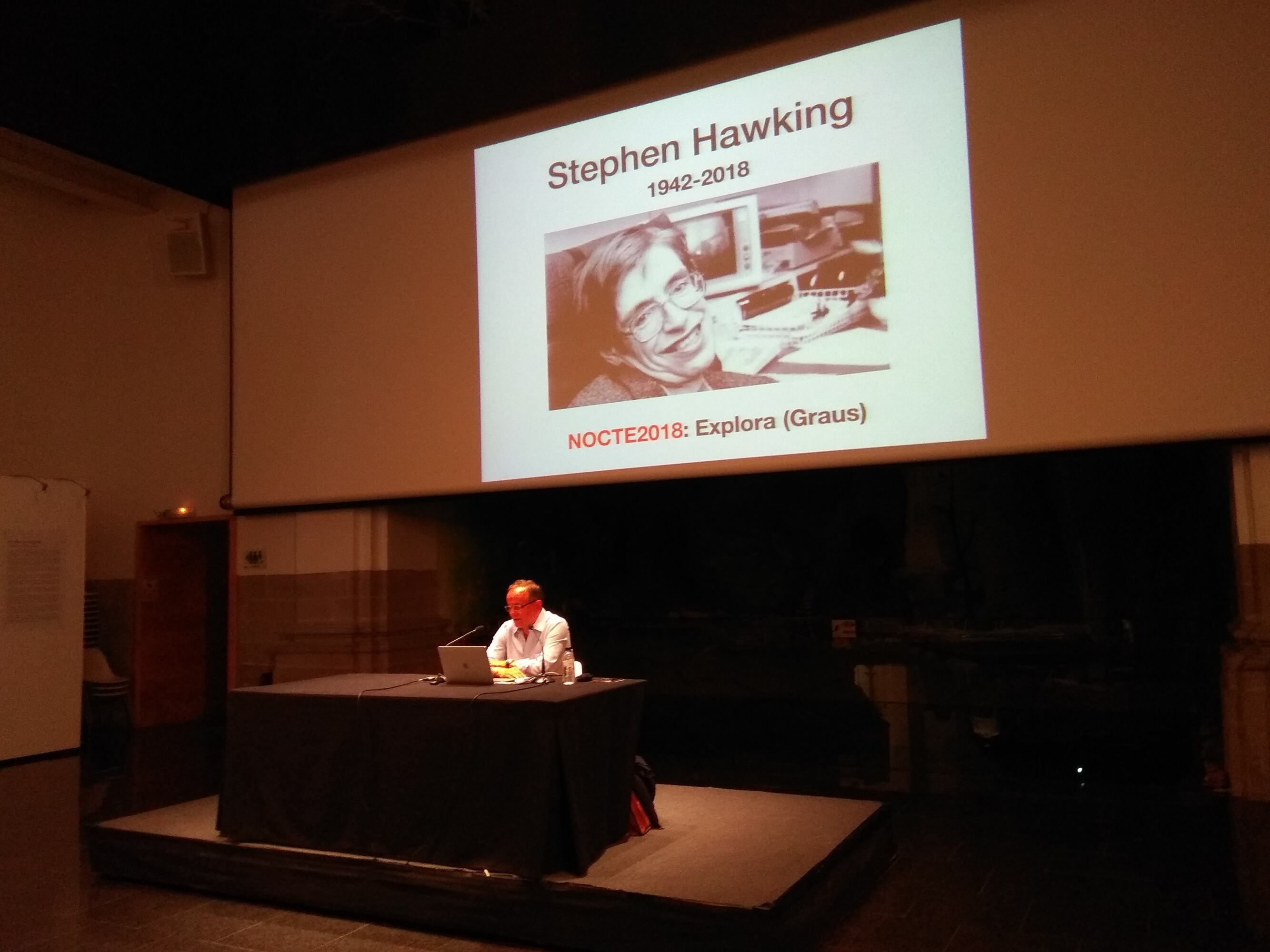 El catedrático, de Física, Manuel Asorey, director también del Centro de ciencias Pedro Pascual de Benasque abría, la XV edición de Nocte con una conferencia sobre Stephen Hawking en la que habló sobre las singularidades de este científico que falleció el pasado mes de marzo. Asorey lo resumía diciendo que la vida de Hawking representa el triunfo de la mente sobre la materia y que fue su voluntad de luchar contra la enfermedad lo que le permitió sobrevivir.