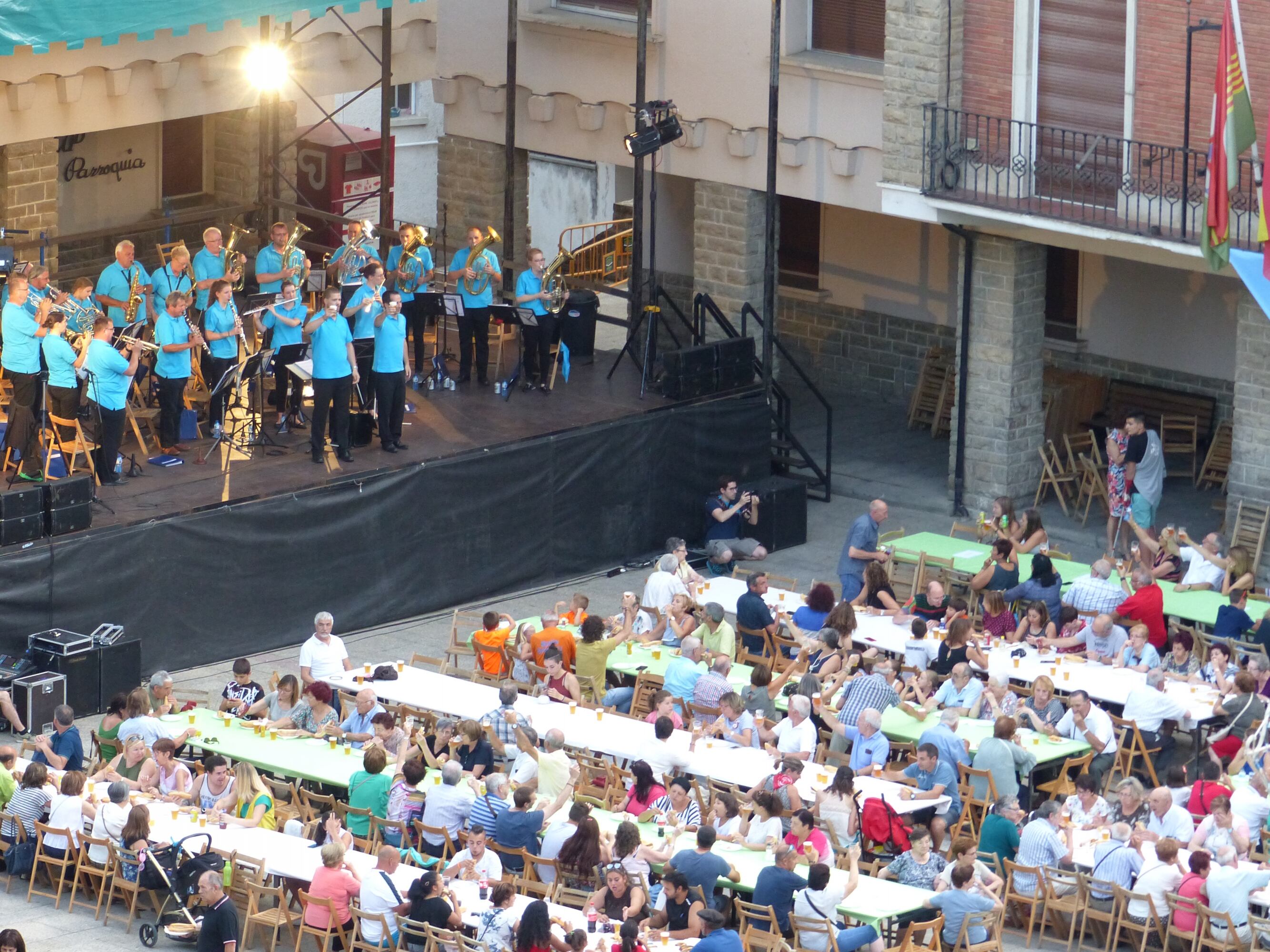 Tarde para juegos y actividades infantiles y la presencia en la calle la Charanga Os Mozés. A las 19,30 Horas el desfile de la Banda de música “Chicotén”.que realizan el recorrido a lo largo de la calle Serrablo hasta el scenario situado en la Plaza de España donde ofrecerán su concierto de fiestas.