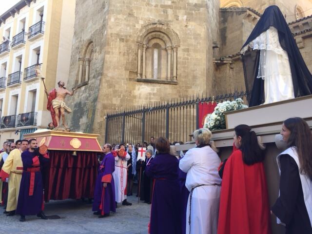 El itinerario de la procesión del Resucitado comenzaba en la Iglesia de Santo Domingo, pasando por el Coso Bajo, calle Ramiro el Monje y Plaza San Pedro, donde se produce el encuentro con la Virgen de la Esperanza, para seguir posteriormente por las calles San Salvador y Las Cortes y llegar a la Catedral.