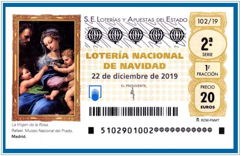 La viñeta del décimo de este año corresponde a una imagen de la Virgen de la Rosa, de Rafael, perteneciente al Museo Nacional del Prado. Se ha elegido esta imagen en homenaje al Bicentenario de la pinacoteca española.