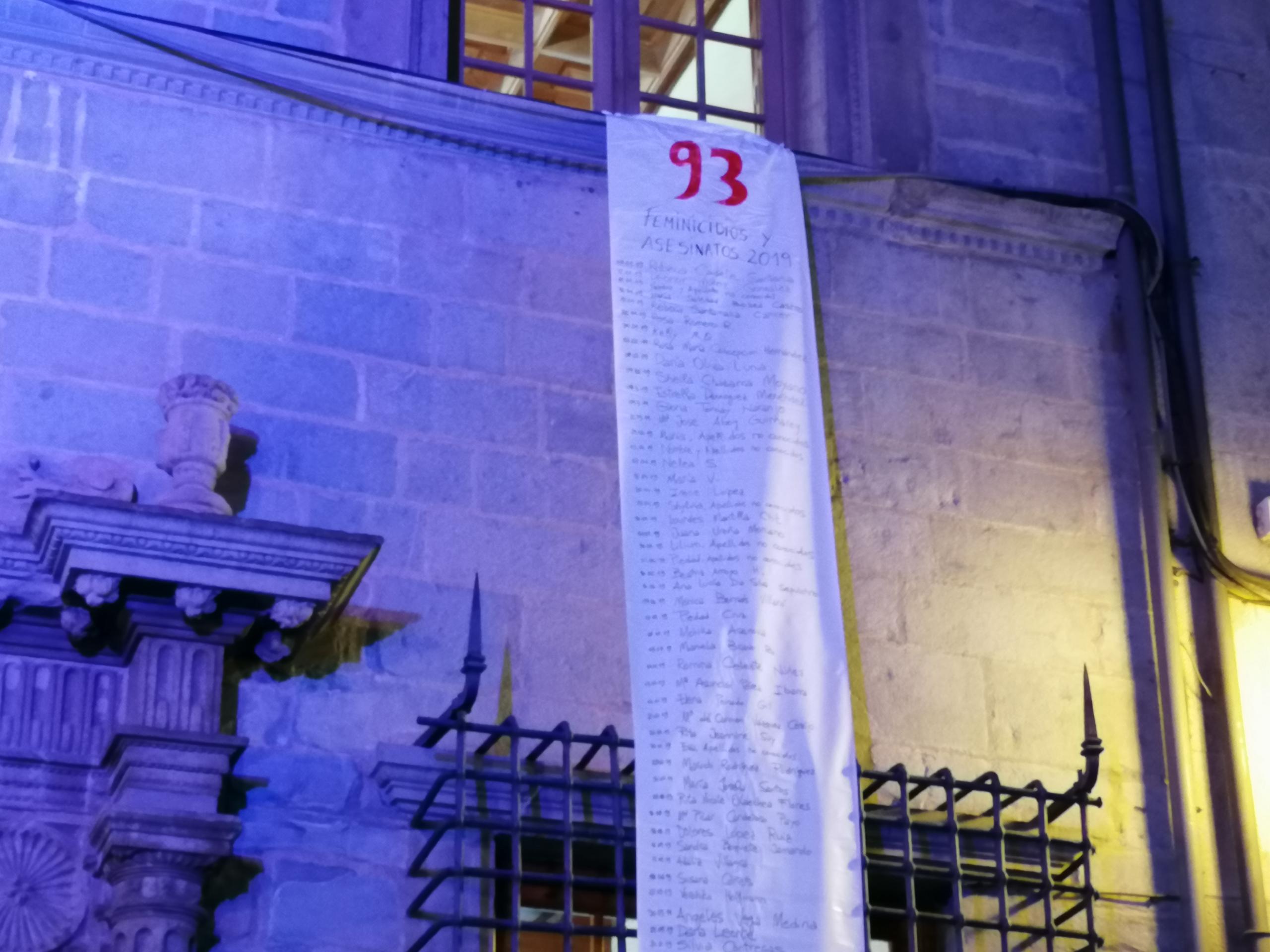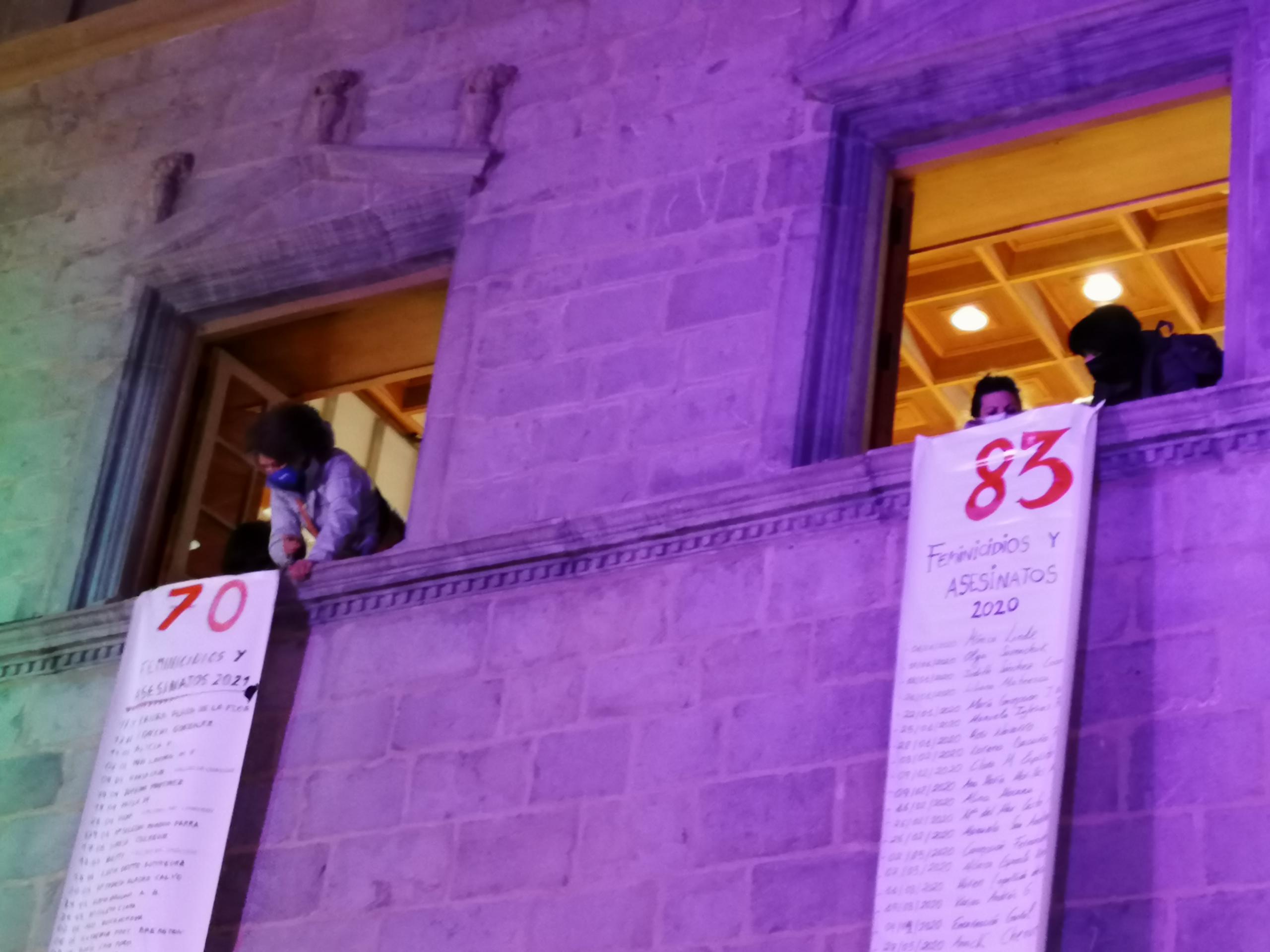 Música para la esperanza, respaldo político y reivindicación ciudadana tenían cabida este jueves en la concentración del Día Internacional de la Eliminación de la Violencia contra las Mujeres en Jaca. Más de un centenar de vecinos querían acompañar la lectura de los manifiestos frente a un ayuntamiento iluminado de morado y con tres largas pancartas que enumeraban una a una las víctimas de la violencia machista en España en los últimos años. Son 37 según los datos oficiales de lo que llevamos de 2021 y 70 según los datos que elegía el colectivo feminista de Jaca (Feminicidio.net), que suma las prostitutas asesinadas, los menores asesinados u otras víctimas como la amiga o la madre que intentó proteger y no había tenido relación sentimental con el agresor.