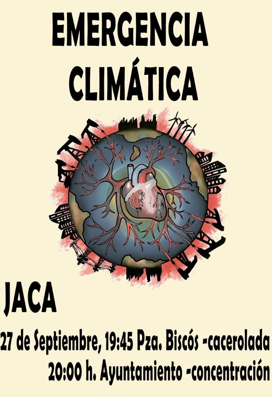 El próximo 27 de septiembre se celebra la Huelga Mundial por el Clima con un alcance global y que, en el caso de España, cuenta con el apoyo de más de 300 organizaciones adheridas al manifiesto publicado el pasado mes de julio “en defensa del futuro, de un planeta vivo y de un mundo justo” para exigir que se tomen las medidas concretas necesarias para reducir rápidamente a cero las emisiones netas de gases de efecto invernadero. En Jaca se ha convocado una cacerolada el viernes a las 19’45 horas en la plaza Biscós que acabará a las puertas del Ayuntamiento con la lectura de un manifiesto. Antes, este miércoles entre 17 y 19’30 horas, habrá un encuentro para pintar camisetas y pancartas en la plaza Biscós.