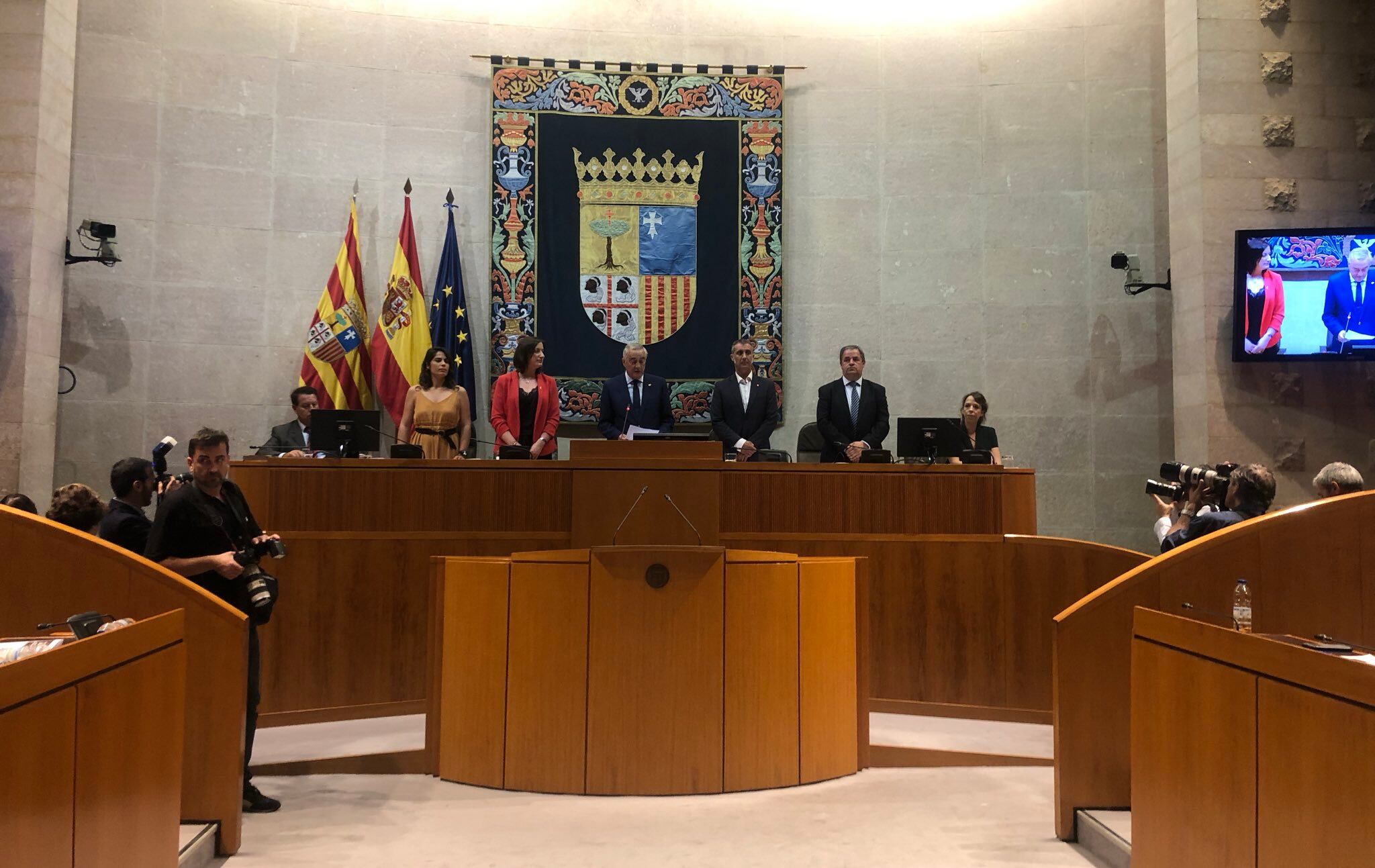 La oscense María Rodrigo ha sido elegida vicepresidenta de la institución tras contar con los votos de 36 diputados que suman la izquierda y el PAR, mientras que en virtud de los acuerdos alcanzados entre el PP y Ciudadanos, el diputado de la formación naranja Ramiro Domínguez ocupará la vicepresidencia segunda al contar con los 28 votos a favor del estos dos grupos. En esta votación los tres diputados de Vox han votado en blanco.