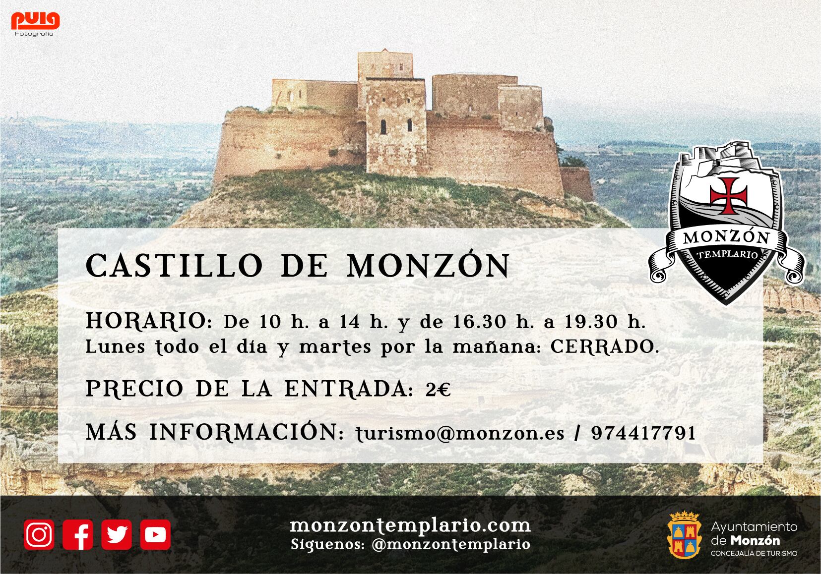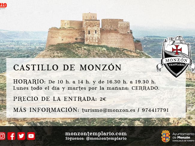 Tras toda una semana con jornada de puertas abiertas en el Castillo de Monzón, la Concejalía de Turismo organiza unas jornadas de precios reducidos en la fortaleza, que se llevarán a cabo del 15 al 19 de julio, en horario de 10h a 14h y de 16.30h a 19.30h. El coste de la entrada será de 2 euros.
