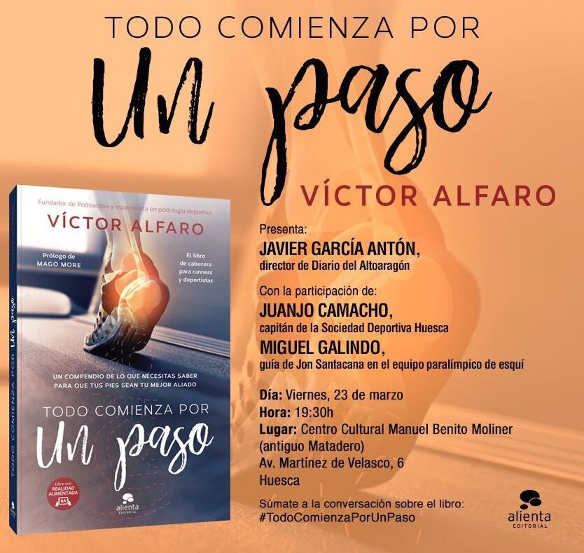 Tras las presentaciones llevadas a cabo en Madrid y Zaragoza, el oscense José Víctor Alfaro, director general de Podoactiva, dará a conocer en un acto público este libro en la capital oscense. Será este viernes día 23 de Marzo, a las 19.30, en el Centro Cultural Manuel Benito Moliner (antiguo Matadero). Entre los participantes estarán Juanjo Camacho, capitán de la SD Huesca y Miguel Galindo, guía de Jon Santacana en el equipo paralímpico de esquí.
