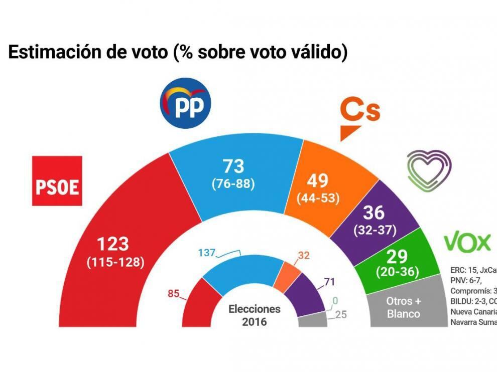 Los socialistas obtendrían el 29,1% de los votos y 123 escaños y el PP caería a 79 y no podría alcanzar la mayoría sumando con Ciudadanos y Vox