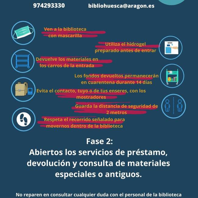 Con la Fase 2 de la desescalada, la Biblioteca Pública de Huesca ha reabierto sus puertas esta semana, aunque únicamente tiene en funcionamiento los servicios de préstamo, devolución y consulta de materiales especiales o antiguos por parte de investigadores. Por el momento, no está permitida la lectura, el estudio ni la consulta en sala. La biblioteca está abierta de lunes a viernes de 9 a 2 y de 4 a 9, y los sábados de 9 a 2.