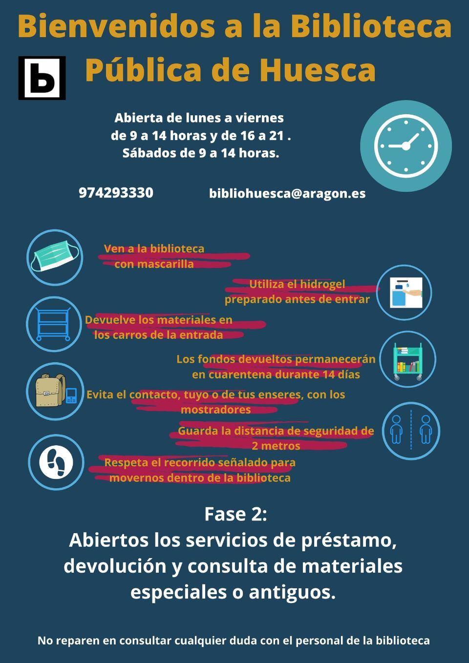 Con la Fase 2 de la desescalada, la Biblioteca Pública de Huesca ha reabierto sus puertas esta semana, aunque únicamente tiene en funcionamiento los servicios de préstamo, devolución y consulta de materiales especiales o antiguos por parte de investigadores. Por el momento, no está permitida la lectura, el estudio ni la consulta en sala. La biblioteca está abierta de lunes a viernes de 9 a 2 y de 4 a 9, y los sábados de 9 a 2.