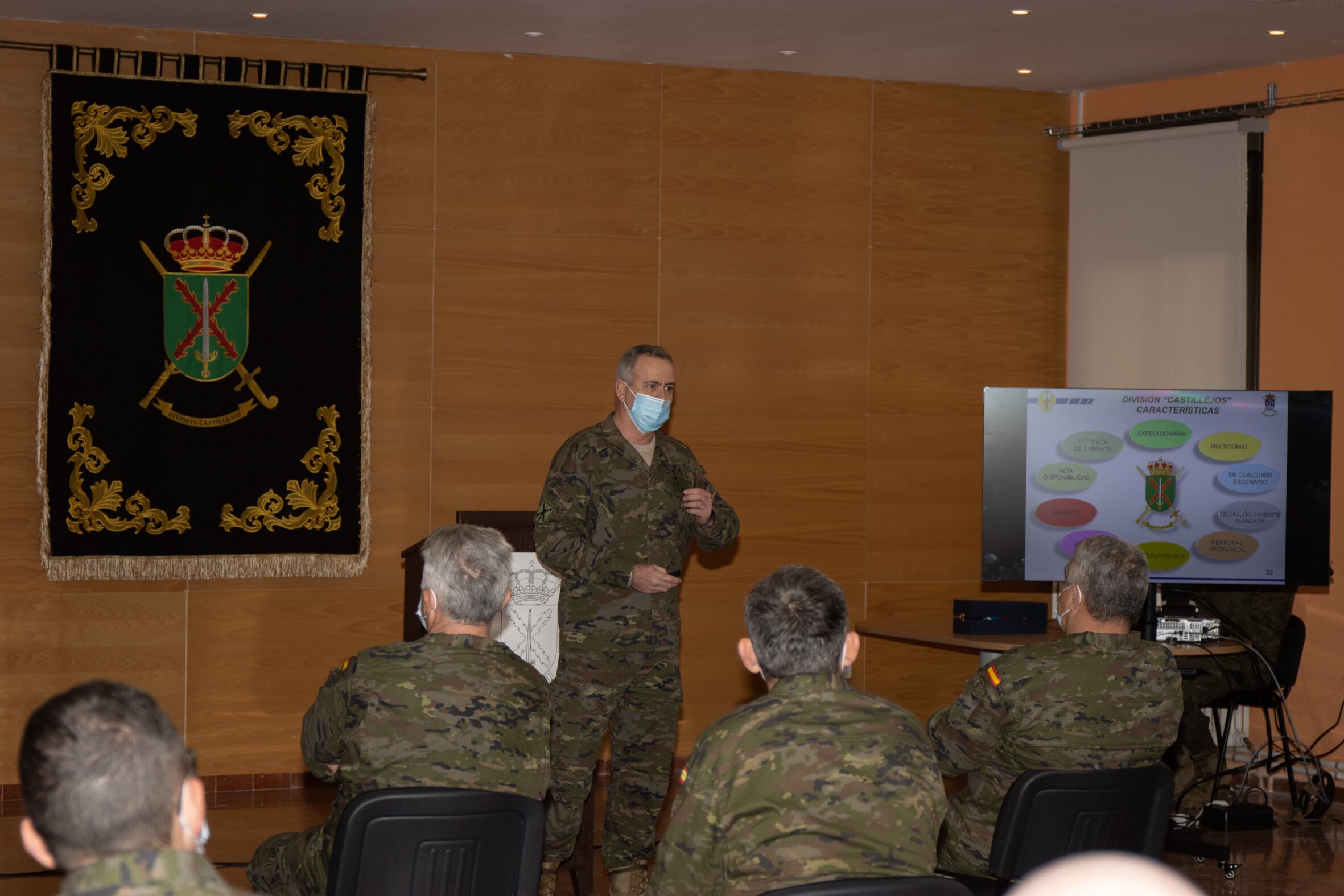 A su llegada a la sede del CG de la División, el JEME, acompañado por el teniente general José Rodríguez, jefe de la Fuerza Terrestre (Sevilla) de quien depende la División “Castillejos”, era recibido por su general, Carlos Jesús Melero. Después de recibir los honores de ordenanza y saludar a las autoridades presentes, se dirigían a una sala, en la que el general de División Melero, responsable de la División Castillejos narraba los antecedentes, y todo el recorrido de la División hasta lo que es hoy en día, explicando todas las capacidades y objetivos de la Castillejos en el nuevo orden del Ejército de Tierra en Huesca, así como las nuevas misiones que asume la División. El JEME, general Javier Valero, reconocía que este acto era la demostración de que con el esfuerzo y apoyo de todos se ha logrado completar este objetivo. Consideraba también muy importante que se haya empezado a notar en la ciudad el impacto económico de la llegada de esta División a Huesca, y aseguraba que esta División es una aportación fundamental que hace España a las estructuras de unidad y defensa de todo el mundo.