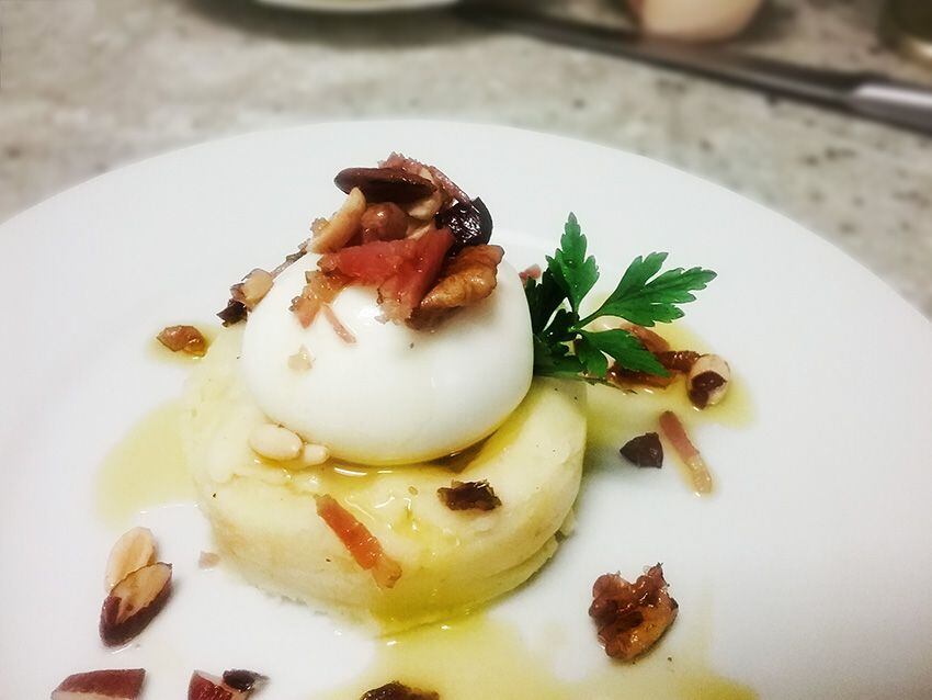La receta con la han estrenado la sección es ‘Parmentier con huevo poché y salteado de frutos secos y beicon’ o como explica José Miguel García, autor de la misma, ‘hablando en castellano, básicamente, es un puré de patata con un huevo cocido que le hemos dado una cocción corta (6 minutos) y un salteadito de beicon y frutos secos para darle un poco de alegría. No os paséis con el salteadito que estos días no os estáis matando a quemar calorías’.
