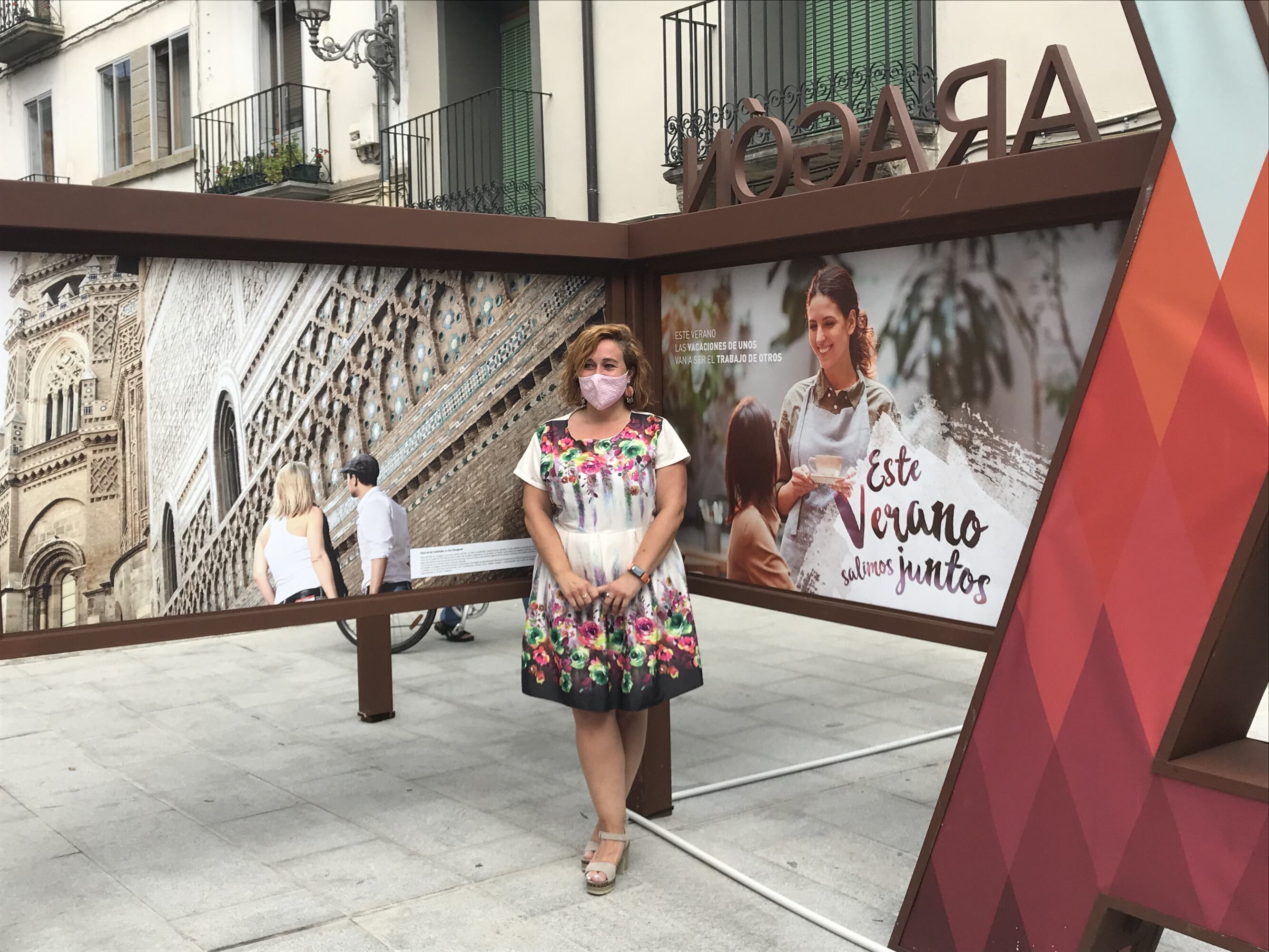La exhibición consta de tres estructuras que presentan ocho fotografías cada una, sobre las diferentes atracciones paisajísticas que ofrece el territorio aragonés. Ana Azuara en representación de la Dirección General de Turismo del Gobierno de Aragón ha detallado la oferta de información y actividades, divididos bien por productos o por provincias, a la que pueden acceder los viandantes que pasen por la exposición. Una de las propuestas que más éxito ha tenido en anteriores exposiciones es el “Slow Driving”, que presenta diferentes rutas por carreteras aragonesas. Además “tenemos una web y una app de turismo familiar en las que se pueden hacer búsquedas segmentadas de qué hacer cuando estás en una población, qué tengo alrededor o qué puedo hacer con niños de determinada edad”, explica Ana.