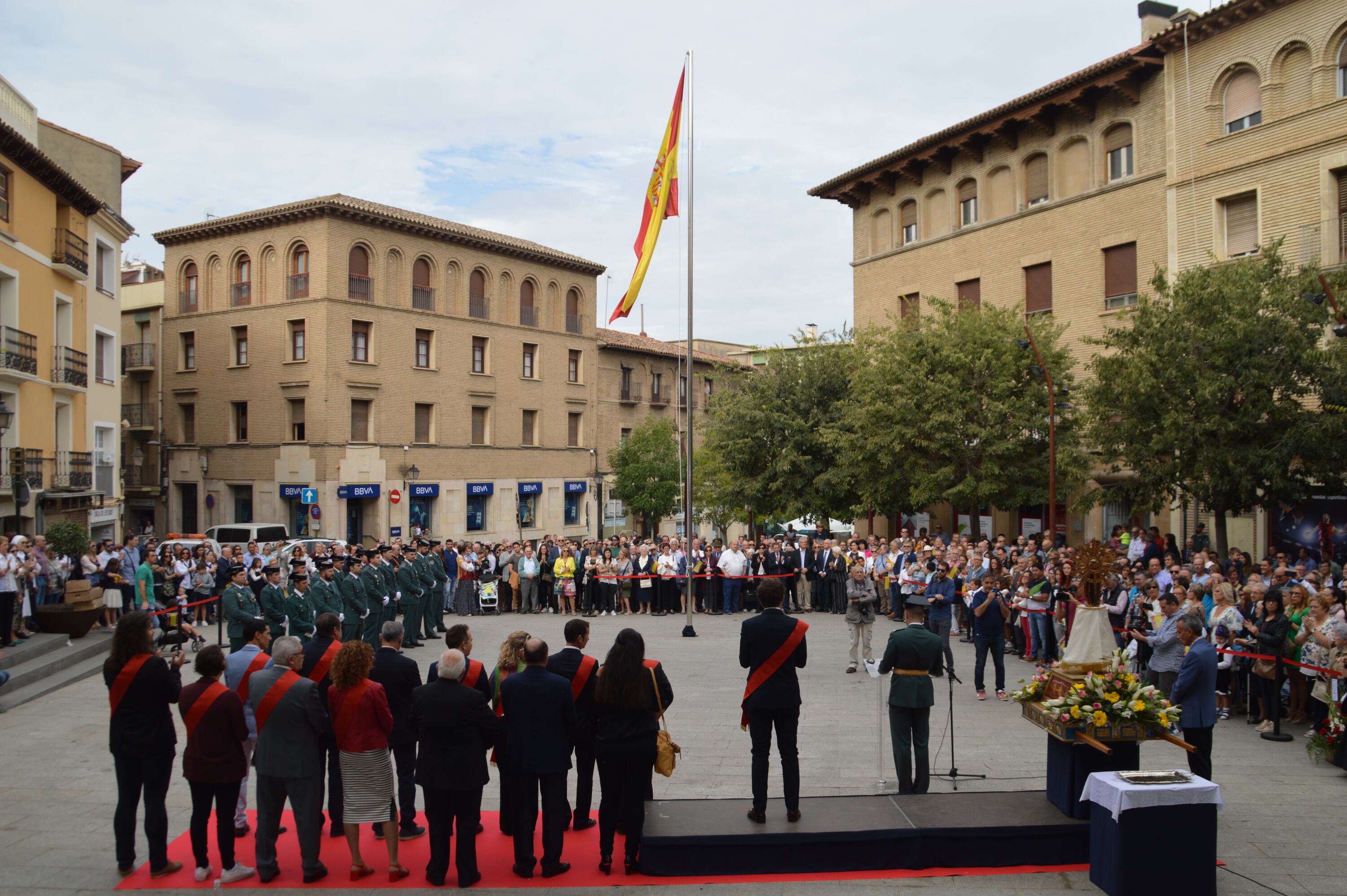 Tras el izado de una enorme bandera de España, sobre un mástil de 12 metros, tomaba la palabra el alcalde de Monzón Isaac Claver, y el teniente de destacamento de Monzón, Pablo Martínez Tortosa. A continuación, los agentes en formación cantaban el Himno de la Guardia Civil y se realizaban las fotos pertinentes.