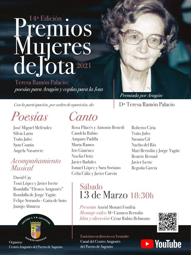 Este sábado a las 18'30 horas el Centro Aragonés de Puerto Sagunto en Valencia acogerá la XIV edición de los premios "Mujeres de Jota" que este año rinde homenaje a la poetisa oscense Teresa Ramón Palacio, fallecida el pasado 12 de febrero de 2020. La gala, marcada por las restricciones de la pandemia, será ofrecida en directo por el Canal de YouTube del centro aragonés y por Huesca Televisión. La redifusión será el domingo a las 22 horas.