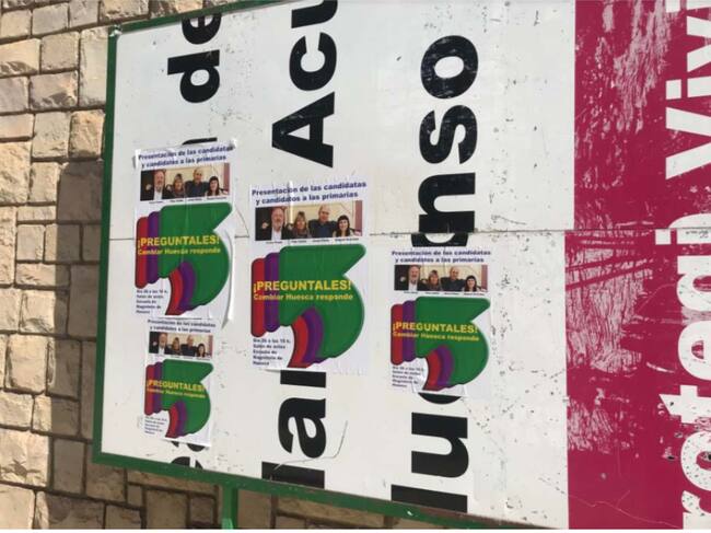 La Junta Electoral ha resuelto la denuncia planteada por Ciudadanos contra Cambiar Huesca por la publicidad electoral que llevó a cabo esta formación política fuera del periodo electoral, tanto en redes sociales, como en espacios físicos reservados para la campaña en la ciudad de Huesca, como en la calle Santo Ángel de la Guarda, junto a la Cámara de Comercio, o en la Avenida Pirineos.