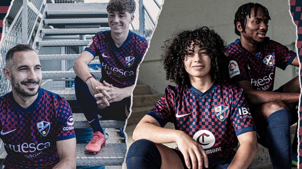 La Sociedad Deportiva Huesca ya ha presentado la que será su primera equipación durante la próxima temporada. Manteniendo los colores azul y grana, esta vez vestirán con un diseño arlequinado de patrón irregular, puños azules y cuello en forma de uve de la mano de Nike. Un concepto totalmente distinto a lo visto durante las últimas temporadas tanto con Kelme como con Bemiser.