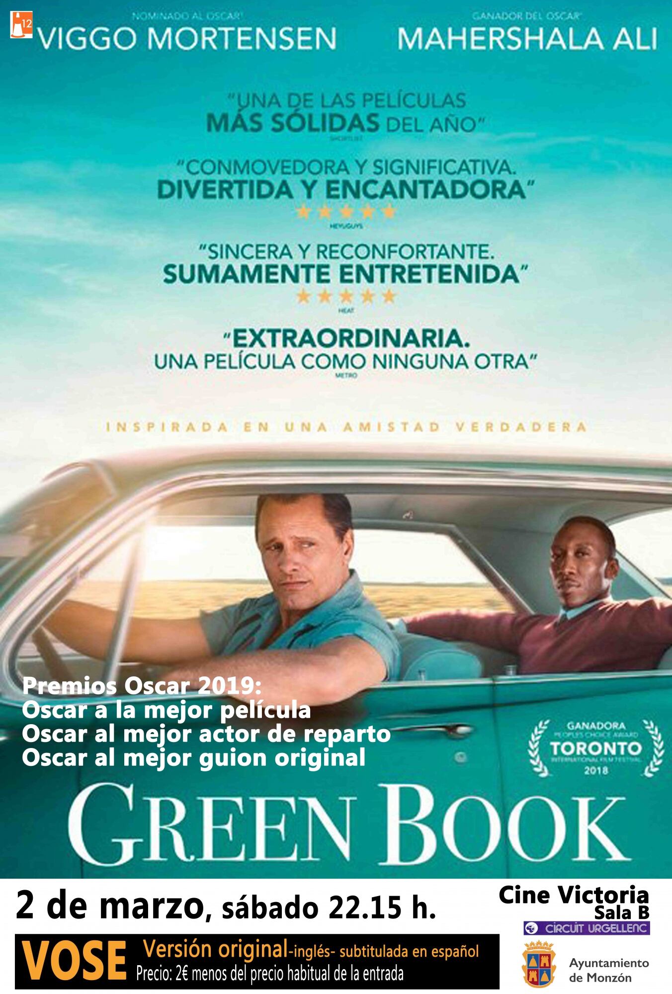 Continúa en Monzón el ciclo de películas en versión original subtituladas en español (VOSE) patrocinado por la Concejalía de Educación. La próxima cita llega este sábado, 2 de marzo, con la película “Green Book”, dirigida por Peter Farrelly. Se proyectará a las 22.15h, en la Sala B del Cine Victoria.