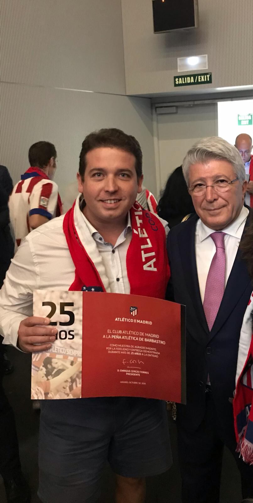 El presidente del club rojiblanco Enrique Cerezo entregó al representante de la peña de Barbastro Guillermo Revilla, un diploma de honor que conmemora el 25 aniversario de su fundación.