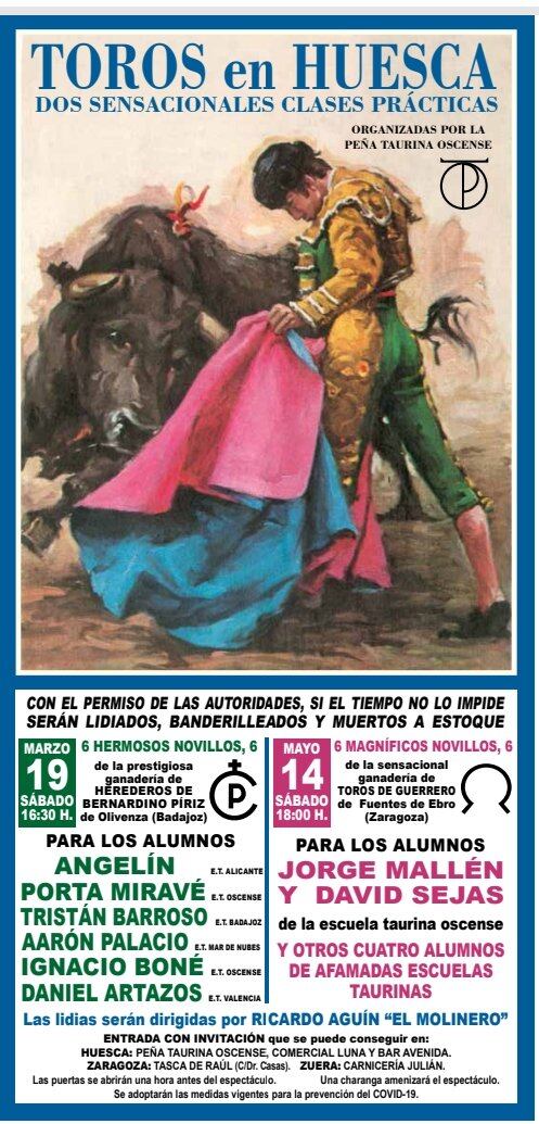 La Peña Taurina Oscense sigue preparando actividades para los próximos meses donde los alumnos de la escuela serán protagonistas en la plaza de toros de Huesca. En concreto, para el día 19 de marzo a las 16:30 horas, se ha programado una clase práctica en la que participarán Porta Mirave e Ignacio Boné en representación de la Escuela Taurina Oscense, junto a otros alumnos de diferentes escuelas.