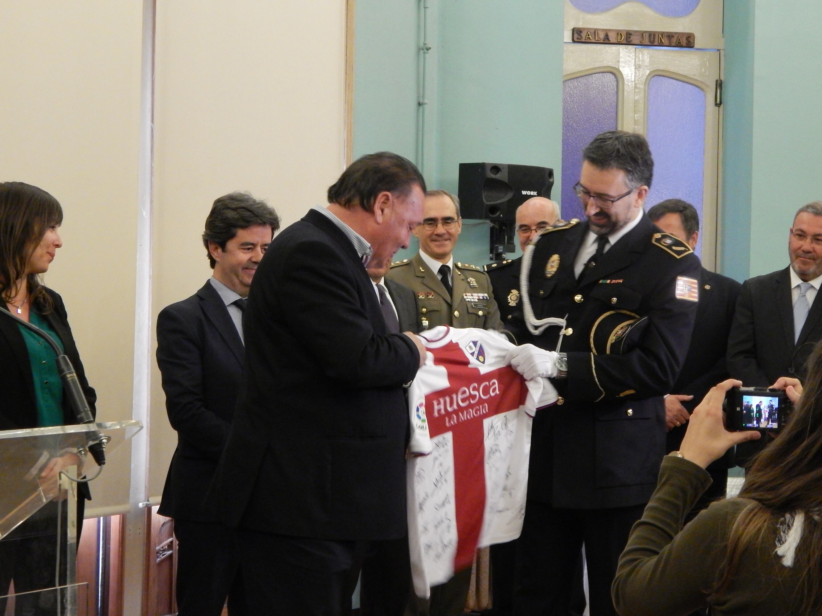 Los reconocimientos durante el acto de celebración en el salón azul del Casino de Huesca eran numerosos para distintos agentes y oficiales por distintos motivos. La SD Huesca realizaba su propio homenaje a la policía por su colaboración durante décadas con el equipo. Asimismo, entregaban distinciones a cuatro agentes por su intervención en un robo con fuerza en las cosas el pasado verano.