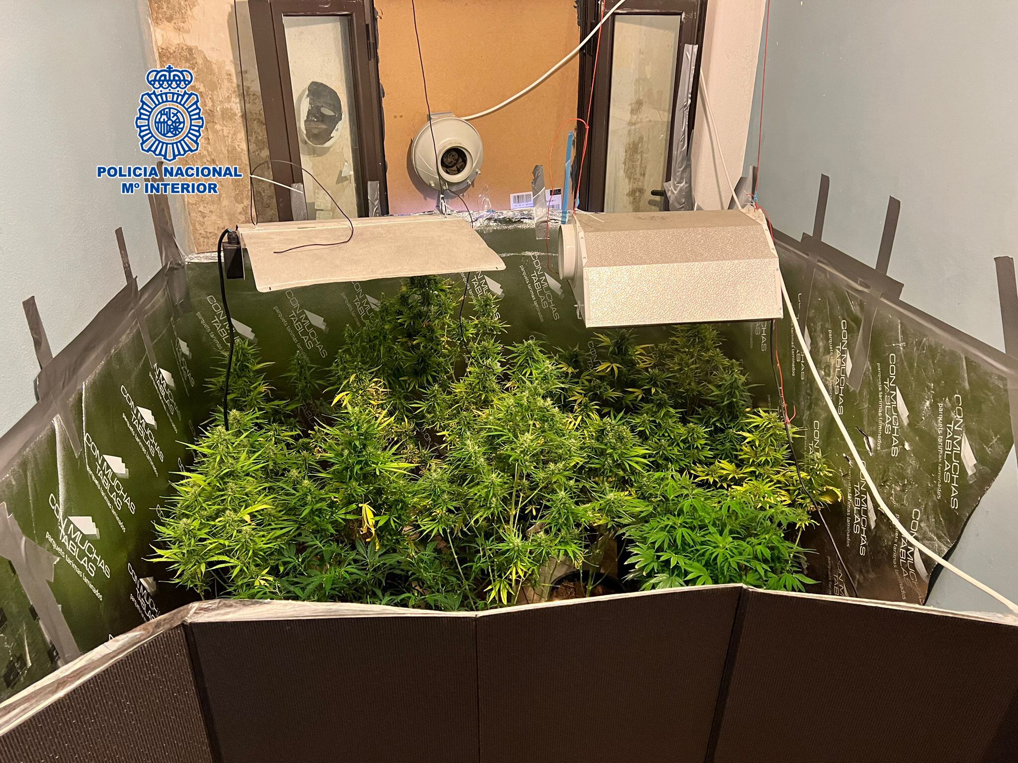 Los policías averiguaron que los investigados, además del piso en el que vendían la droga, también habían okupado el piso superior y que habían transformado el mismo en una plantación indoor de marihuana, para lo que habían realizado enganches ilegales al suministro eléctrico.