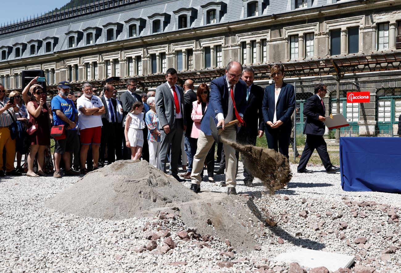 Con este acto de colocación de la primera piedra comienzan los trabajos constructivos para la rehabilitación integral del edificio de la Estación Internacional de Canfranc, la urbanización de la explanada y los trabajos para garantizar el tráfico ferroviario, unos trabajos que incluyen la construcción de una nueva estación de tren y una nueva playa de vías.
