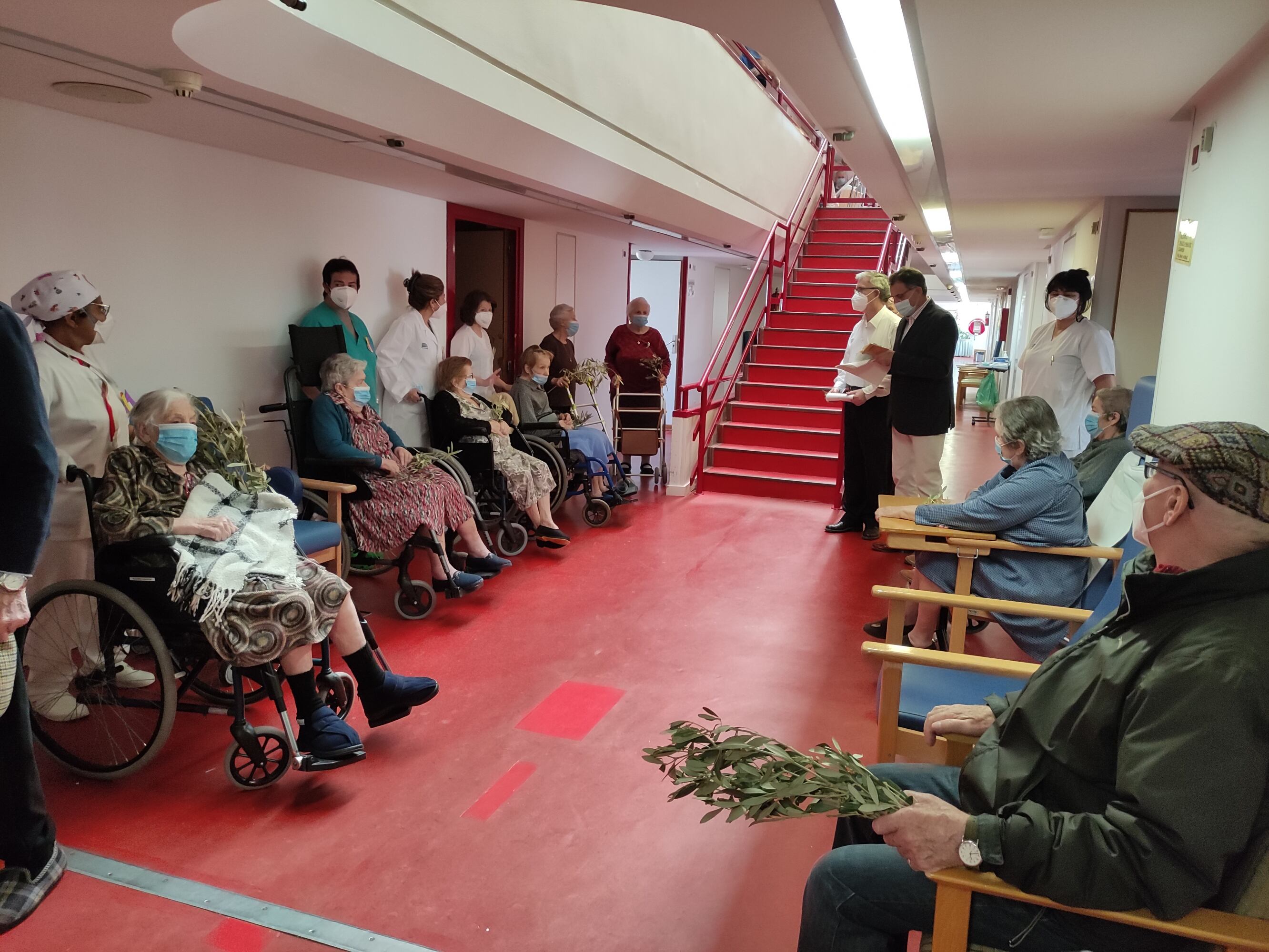 Usuarios y trabajadores de la Residencia 'Ciudad de Huesca' no han querido perderse el Domingo de ramos, así que con la elaboración previa en los talleres del material necesario y sin que falte la rama de olivo , han organizado su particular procesión con discurso incluido.