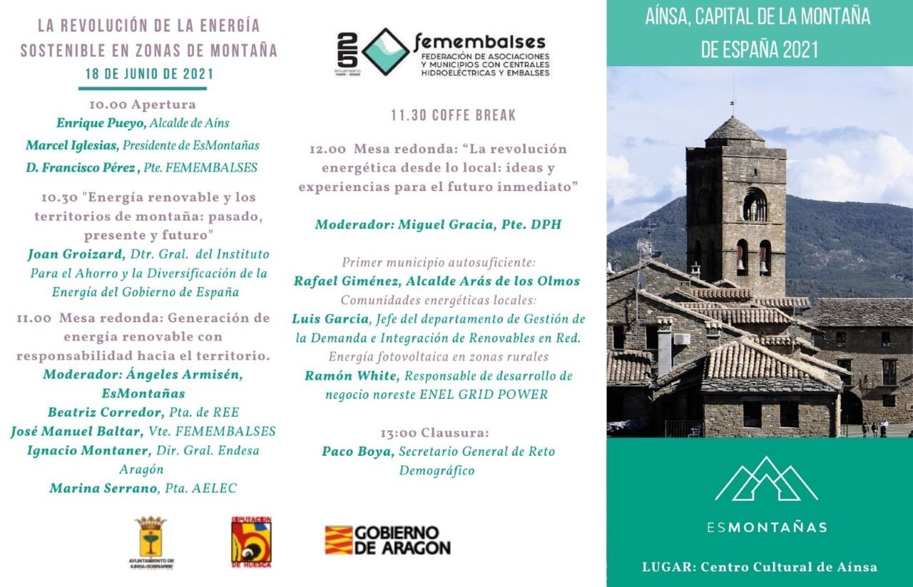 El programa recoge una primera intervención del director general de Instituto para el Ahorro y Diversificación de la Energía del Gobierno de España, Joan Groizard, que abordará el pasado, el presente y el futuro de las renovables en zonas de montaña. Seguidamente se tratará la generación de energía en una mesa redonda en la que participará, entre otros, el director general Endesa Aragón, Ignacio Montaner o la presidenta de la Red Eléctrica de España (REE), Beatriz Corredor.