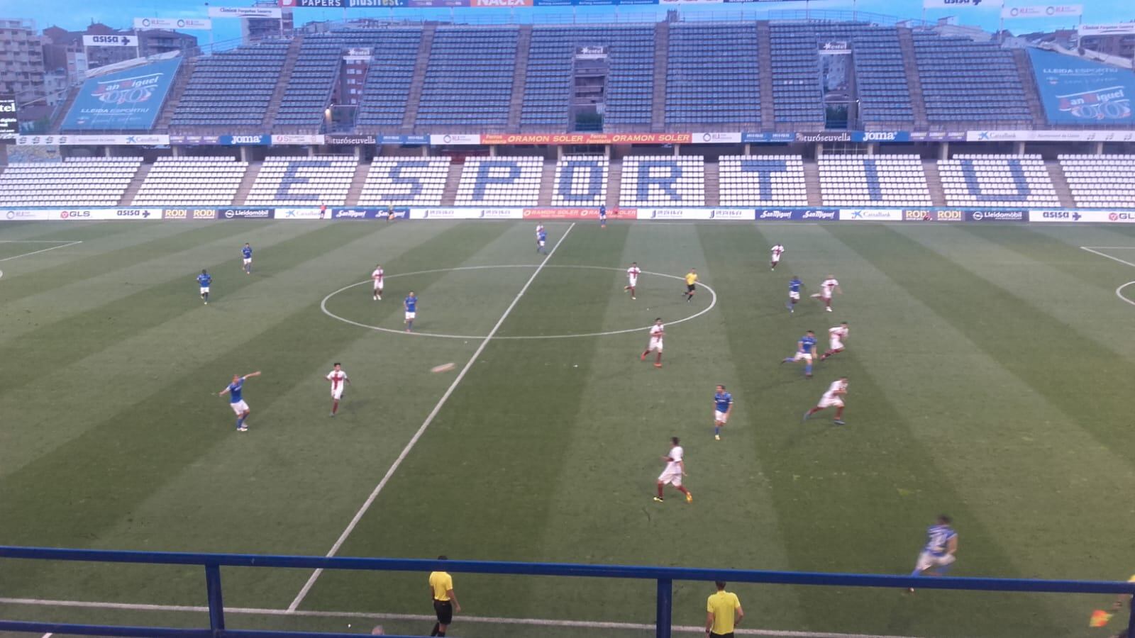 La primera parte del encuentro comenzó con dominio local ante un Huesca que reservó a varios jugadores de la plantilla para no sobrecargarlos. Los leridanos se adelantaban en una buena contra en el minuto 12 obra de Alpha. Seguidamente, en el 20, conseguía el empate Melero. A partir de ese momento los oscenses presentaron su calidad y superioridad adelantándose en el 39 con gol de Moi. Casi al final de los primeros 45 minutos el colegiado pitaba un penalti de Pulido que transformaba Pedro Martín y que dejaba el empate (2-2) en el marcador.