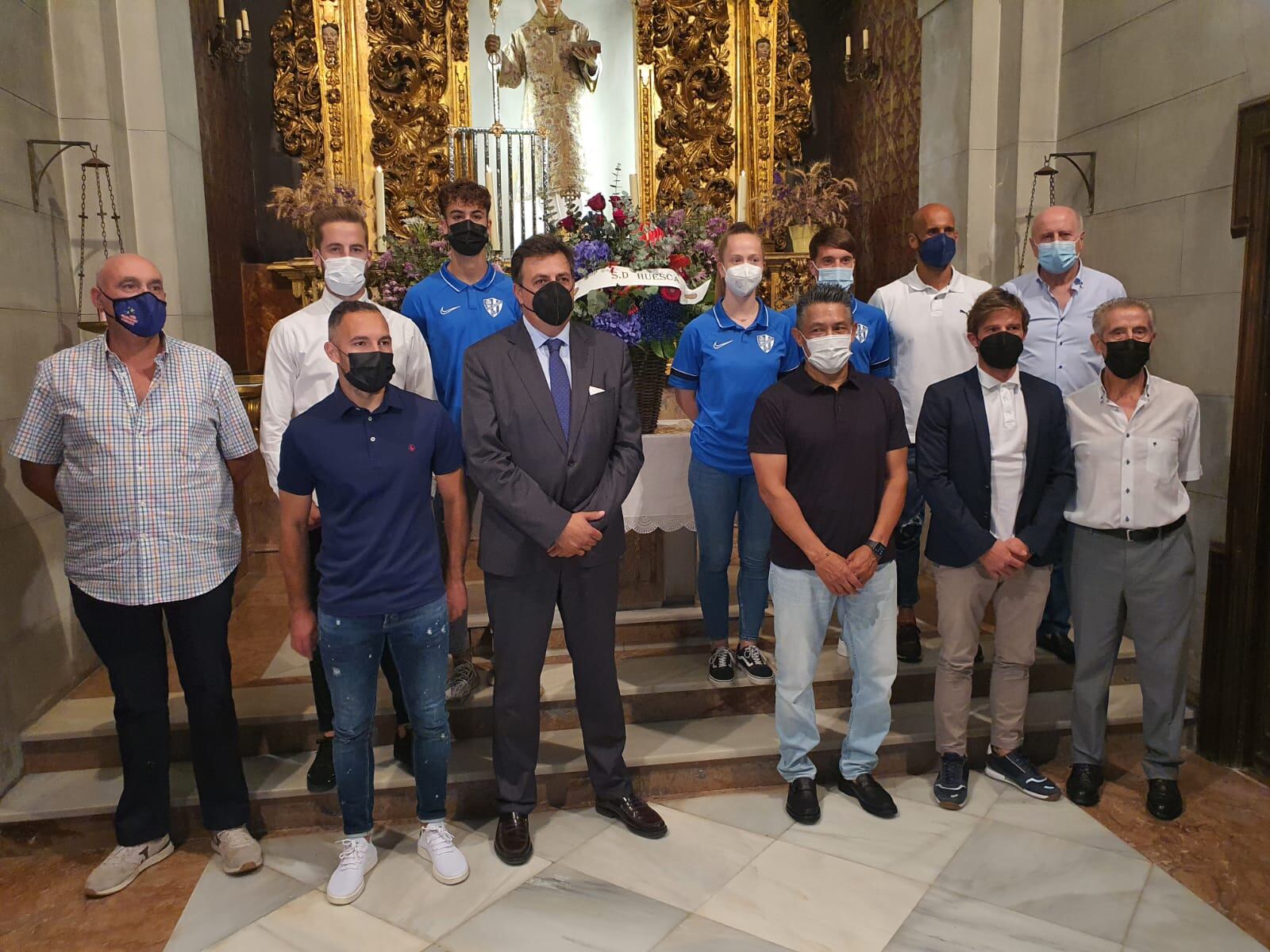 La Basílica de San Lorenzo acogía este jueves, una temporada más, a la SD Huesca en su tradicional ofrenda al patrón de la ciudad. En esta ocasión, el acto se celebraba de forma más reducida debido a las circunstancias sanitarias. Con el consejero delegado, Manuel Torres, a la cabeza, estaban el entrenador y los capitanes del primer equipo, Nacho Ambriz, Jorge Pulido, Mikel Rico y David Ferreiro, el jugador de la SD Huesca B, Gustavo Abizanda, una de las capitanas del Femenino, Julia Sanz, y en representación del fútbol base, asistía Martín Luna.