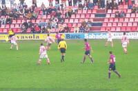 El equipo de Txuma Martón vencía 2-0 en un partido donde se vio poco fútbol y mucha lucha en un terreno de juego muy pesado por la lluvia caída antes del encuentro. Bona, a los ocho minutos, y Espinosa, en la recta final del choque, conseguían los goles de un Huesca que sumaba su quinto triunfo consecutivo que le ha llevado a lo más alto de la clasificación. El Barbastro terminó con diez hombres por expulsión de Chelu. Los rojiblancos se llevaron un rosario de tarjetas que pueden pasar factura en las jornadas venideras.