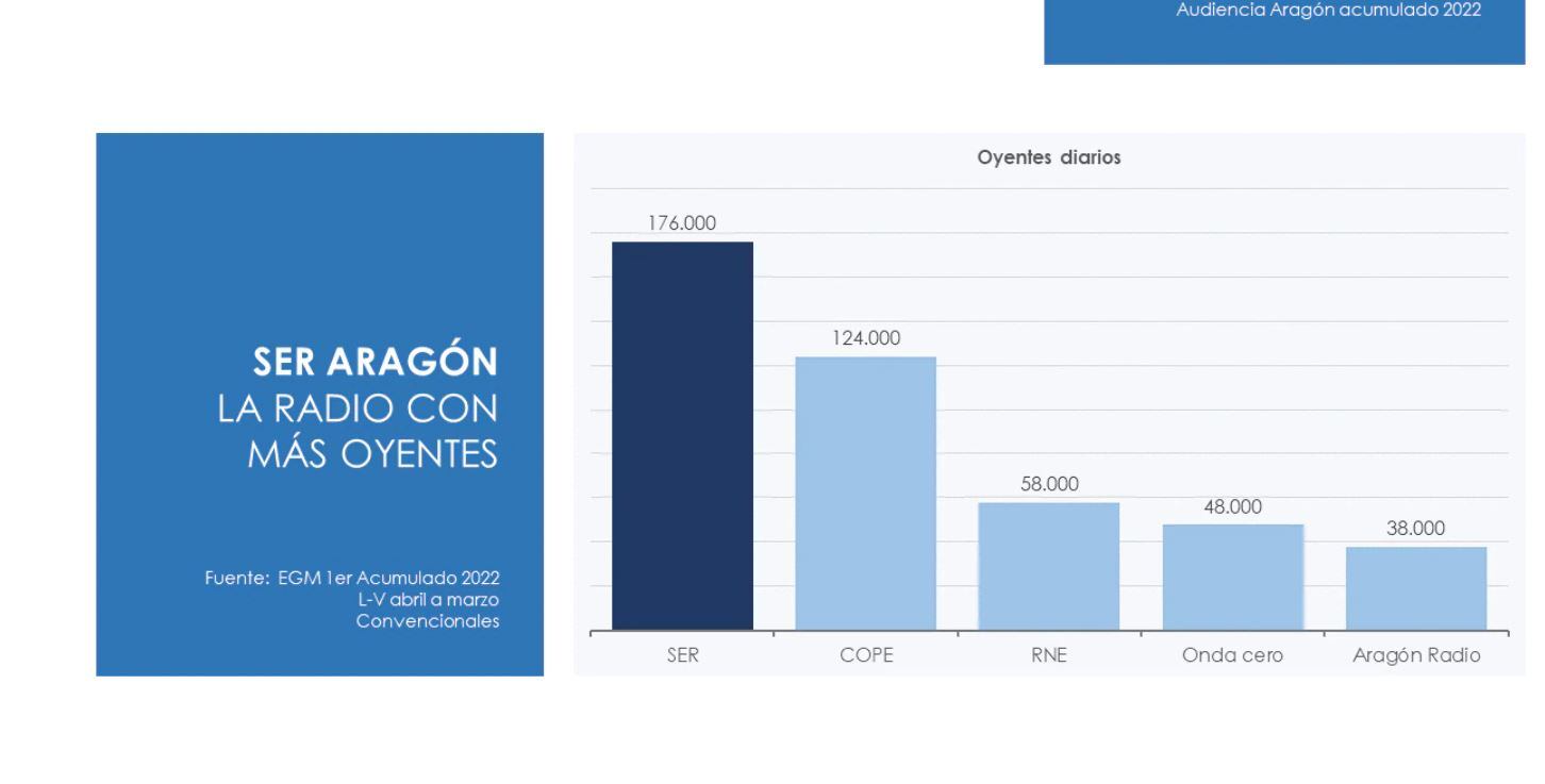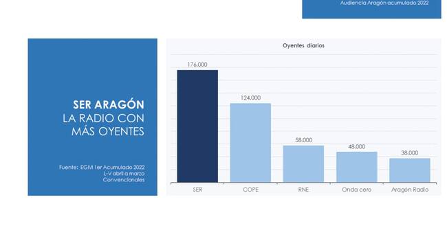Aragón sigue eligiendo la SER, con esos 176.000 oyentes, que dejan a distancia a otras emisoras. Ni sumando la audiencia de la Cadena Cope con la de Onda Cero, 172 mil las dos, consiguen esa audiencia que, una vez más, elige a la Cadena SER.
