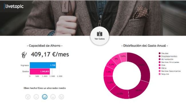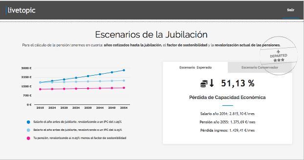 Por ejemplo, comenta Antonio, «ahora que estamos siendo bombardeados con el tema de las pensiones, en Livetopic te mostramos una aproximación de cuál va a ser tu pensión cuando te jubiles y la diferencia que tendrás con tus ingresos actuales. Es una comparativa muy ilustrativa. Actualmente en España la gente se está jubilando con un grado de cobertura cercano al 80 %, pero ante los nuevos cambios legislativos y la revalorización de las pensiones actuales, las siguientes generaciones se jubilarán con una cobertura de la seguridad social mucho menor. Por tanto, o empezamos ahorrar ya o viviremos con estrecheces económicas».