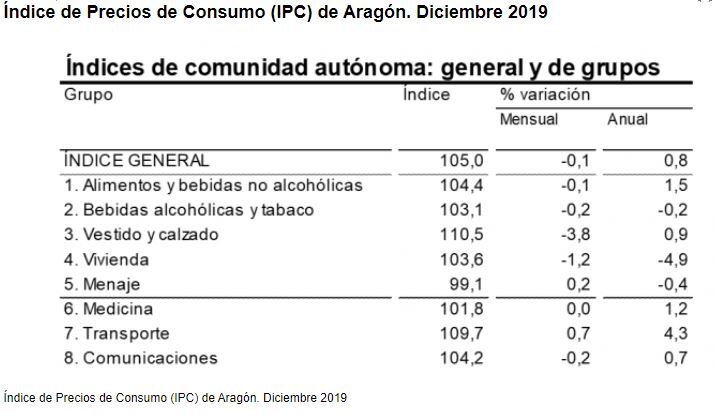 Respecto al mes de diciembre del año anterior, las tasas anuales de inflación en Aragón eran positivas en diciembre en ocho de los doce grupos de consumo considerados por el IPC, siendo negativa en los cuatro grupos restantes. Fueron positivas en Fueron positivos los grupos de transporte, hoteles,cafés y restaurantes, otros bienes y servicios, alimentos y bebidas no alcohólicas, enseñanza, medicina, vestido y calzado y comunicaciones. Los precios se redujeron en diciembre en bebidas alcohólicas en tabaco, menaje, ocio y cultura y vivienda, debido a la disminución de los precios de la electricidad.