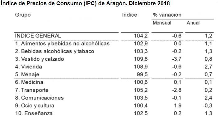 Respecto al mes de diciembre del año anterior, las tasas anuales de inflación en Aragón eran positivas en once de los doce grupos de consumo considerados por el IPC. A la cabeza de la relación en diciembre se situó en Aragón el grupo de Vivienda, seguido por el grupo de Comunicaciones, Hoteles, cafés y restaurantes, Enseñanza, Bebidas alcohólicas y tabaco, Alimentos y bebidas no alcohólicas, Otros bienes y servicios, Vestido y calzado, Menaje, Transporte y Medicina, y Transporte.