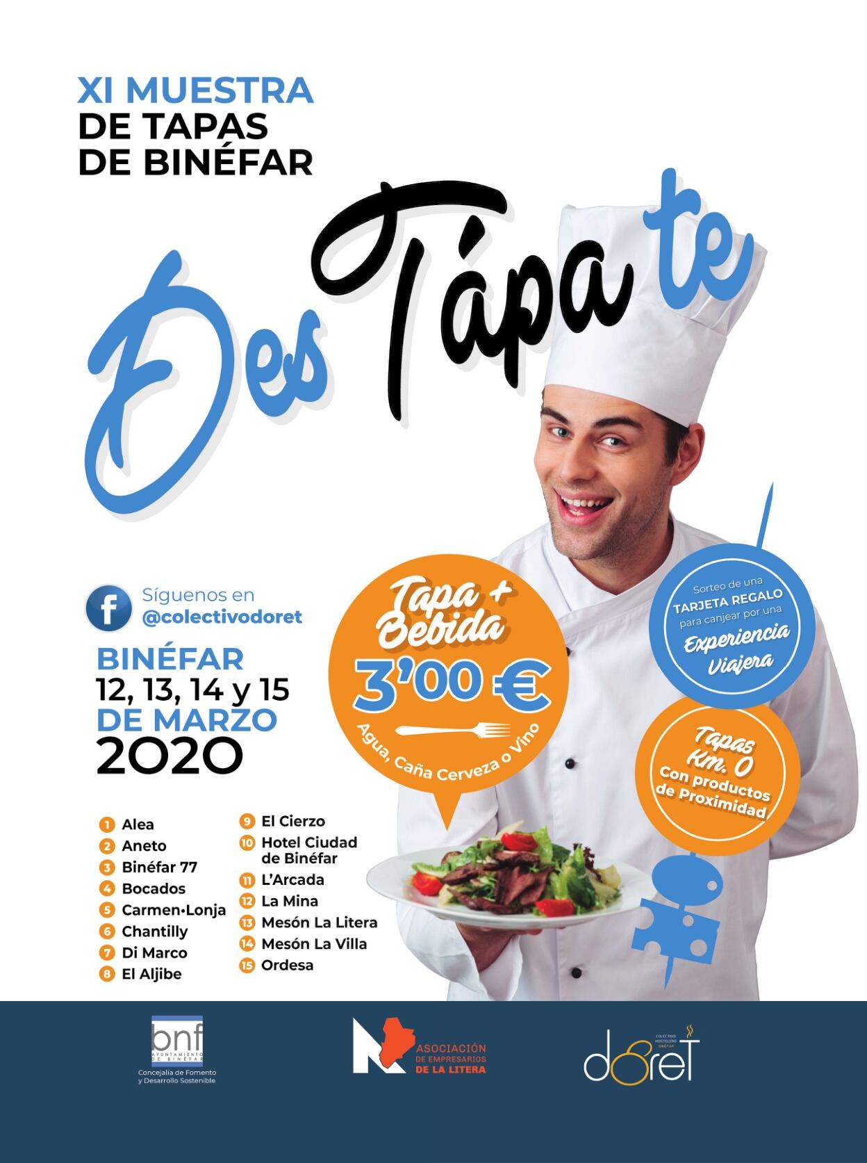 Una ruta de quince establecimientos hosteleros, integrados en el Colectivo “Doret”, participarán en la XI Muestra de Tapas “DesTápate” que se desarrollará del 12 al 15 de marzo en Binéfar, organizada por el Ayuntamiento de Binéfar y la Asociación de Empresarios de la Litera –donde se incluye el colectivo-, que esperan reeditar el éxito de las últimas convocatorias, cerradas con más de 9.000 tapas vendidas.