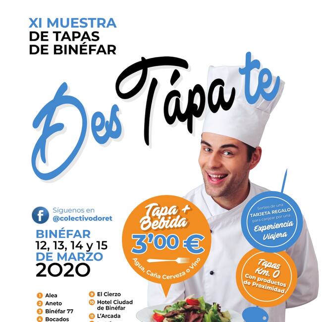 Una ruta de quince establecimientos hosteleros, integrados en el Colectivo “Doret”, participarán en la XI Muestra de Tapas “DesTápate” que se desarrollará del 12 al 15 de marzo en Binéfar, organizada por el Ayuntamiento de Binéfar y la Asociación de Empresarios de la Litera –donde se incluye el colectivo-, que esperan reeditar el éxito de las últimas convocatorias, cerradas con más de 9.000 tapas vendidas.