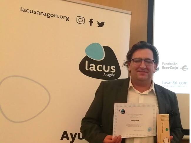 La Fundación Lacus Aragón, entidad que trabaja en favor de las personas con discapacidad intelectual, celebró su X aniversario. En el transcurso de la cena hizo entrega de las distinciones especiales por dicho aniversario. Una de ellas fue para el oscense Toño Julve como colaborador especial como presentador y cantador de jota.