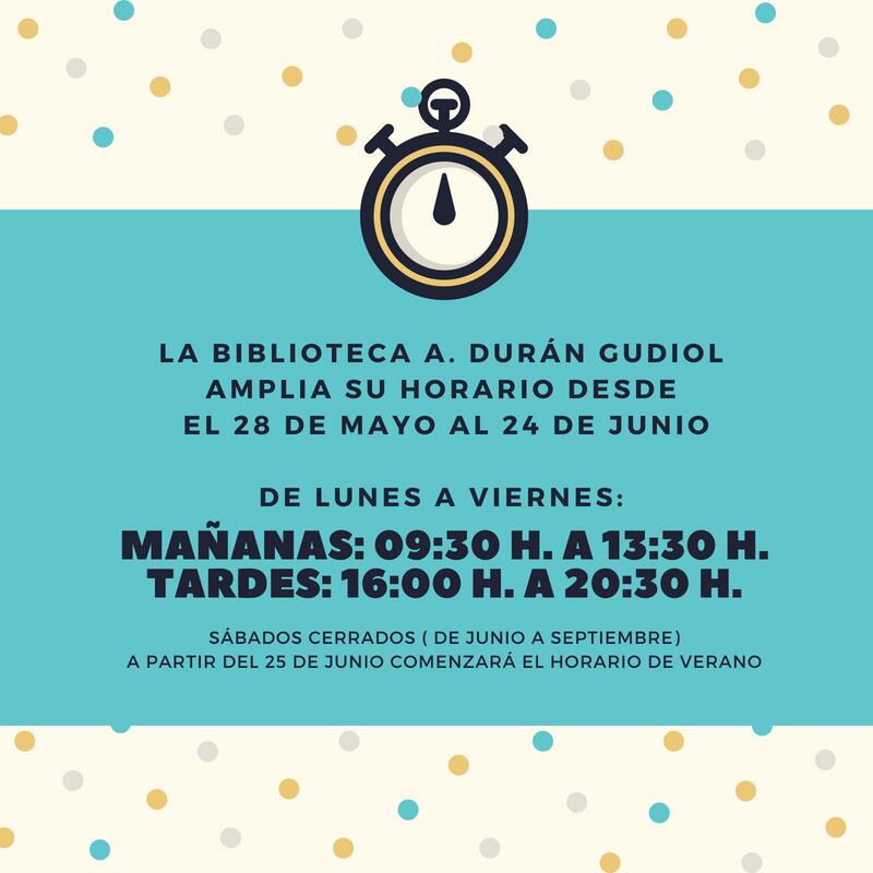 La biblioteca municipal Antonio Durán Gudiol, en la calle Alfonso II de Aragón, ha dado a conocer que amplía su horario durante cuatro semanas, desde este lunes 28 de mayo, hasta el domingo 24 de junio. Por temporada de exámenes abrirá de lunes a viernes de 9 y media de la mañana a 1 y media de la tarde, y de 4 a 8 y media de la tarde.