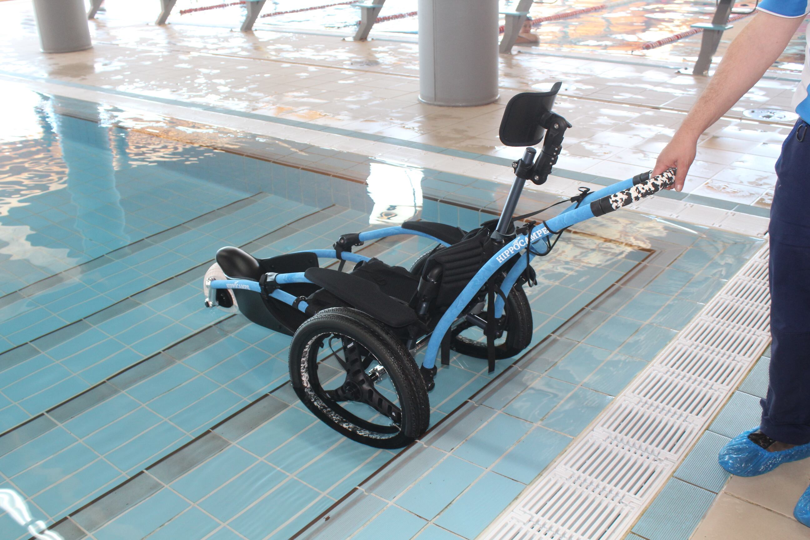 Esta silla facilita el baño en la piscina climatizada y el parque acuático a las personas con movilidad reducida