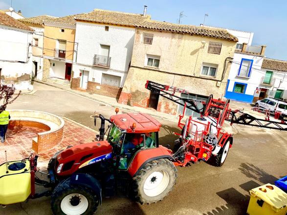 Los agricultores ponen sus tractores para desinfectar las calles de los pueblos