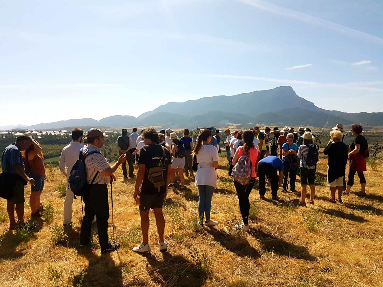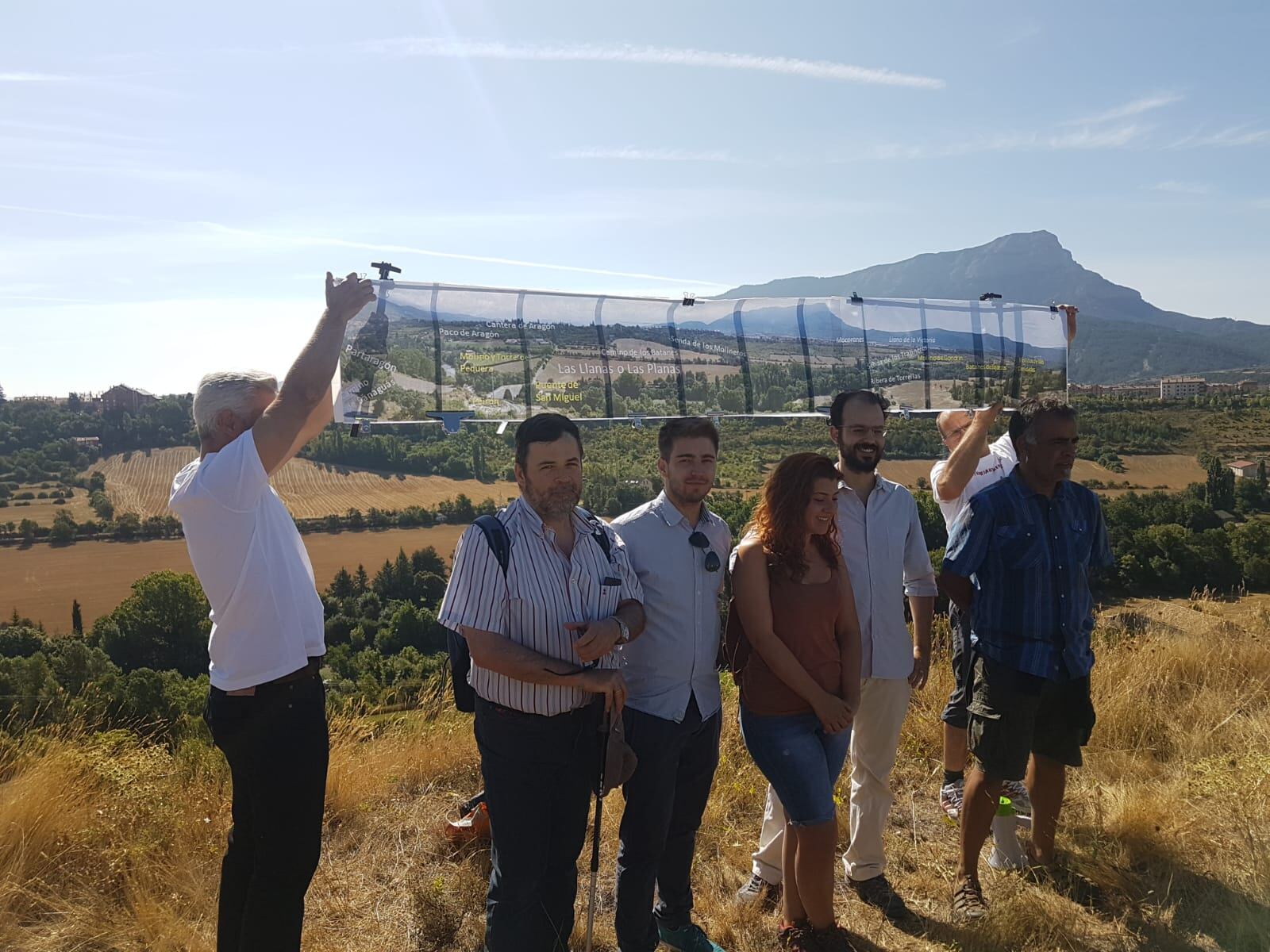 Federico Fillat, guía de la expedición, desplegó una foto panorámica ilustrada con los nombres toponímicos, que describen la industria hidráulica de la ribera de Jaca los Molinos de las Caridades (desde la Edad Media), uno harinero y 2 batanes y en el S-XVIII también un tinte.