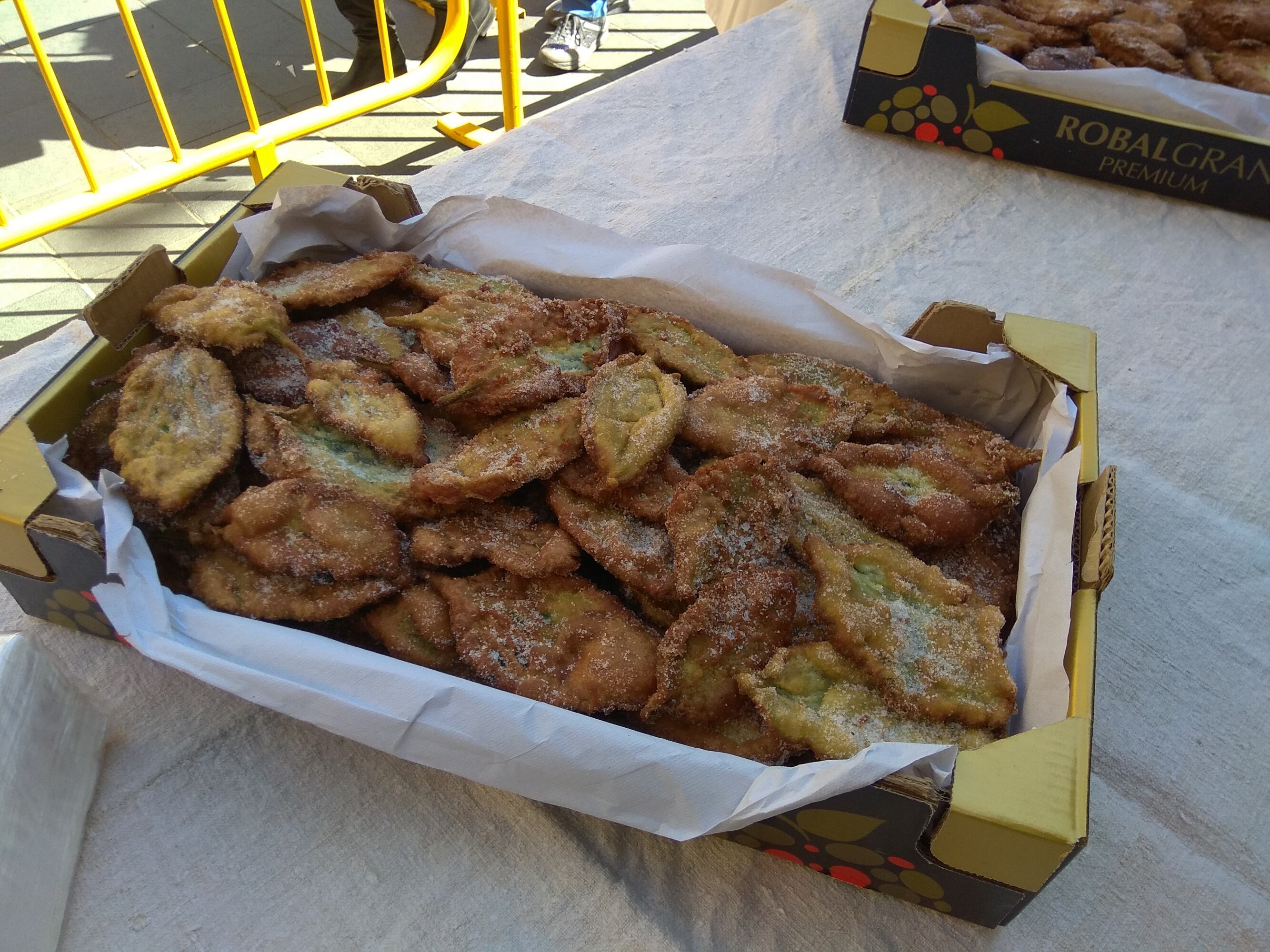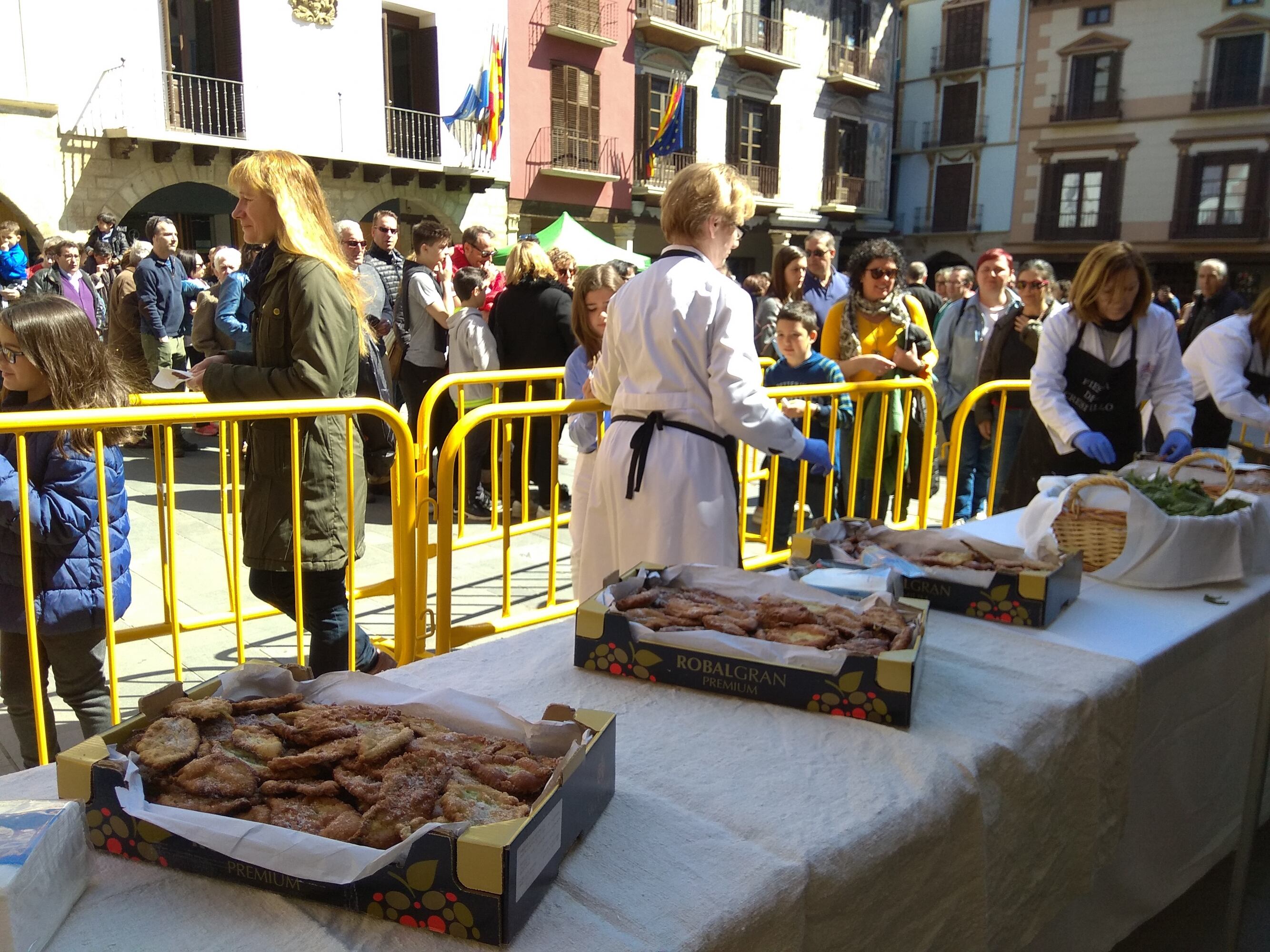 Desde las 8 de la mañana un grupo de 8-10 vecinos del Barrichós se afanaban, en la plaza Mayor, en elaborar la masa y tener a punto las hojas de borraja, producto básico para elaborar los crespillos, que se freían tres hornillos para después espolvorearlos con azúcar.