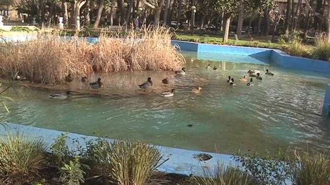 Los patos del parque Miguel Servet de Huesca se han mudado a otro estanque, pero lo hacen de forma provisional. Una empresa especializada está realizando labores de limpieza del estanque del parque. Son trabajos periódicos que en este día han dejado este lago artificial vacío. Mientras duran estos trabajos los patos del parque se han trasladado a otro estanque cercano, también en el parque. Son ellos mismos los que han buscado otro emplazamiento provisional y se han mudado a otro estanque a escasos metros. Allí permanecerán hasta que se acabe de limpiar su casa.