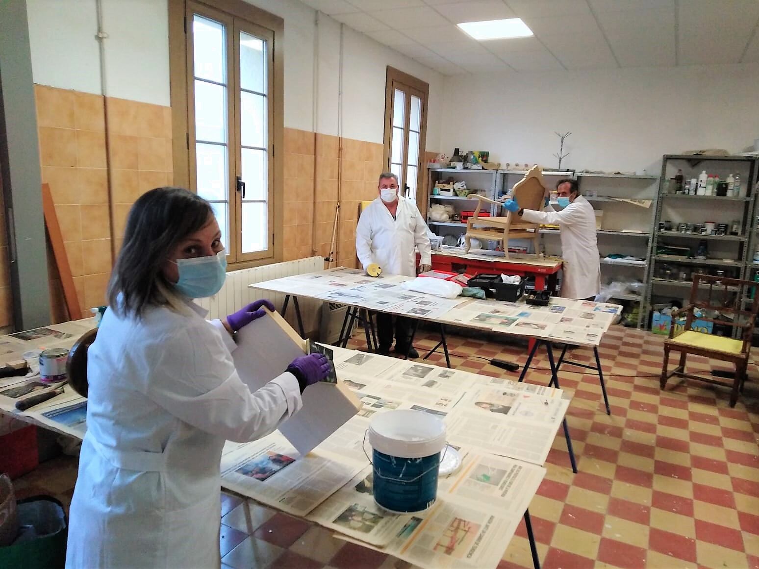 El seguimiento personal es a cargo del monitor, Joaquín Sanz, que nos comentaba que “se han adaptado a las normas de seguridad ante la covid-19 y que les sorprendió la nueva normativa con el comienzo del curso, pero se ha podido salvar con los grupos formados”. Sus integrantes “ llevan el material, la mayoría muebles que han recuperado de casas de pueblos y otros que compran objetos que los quieren adaptar o dar una imagen antigua”.