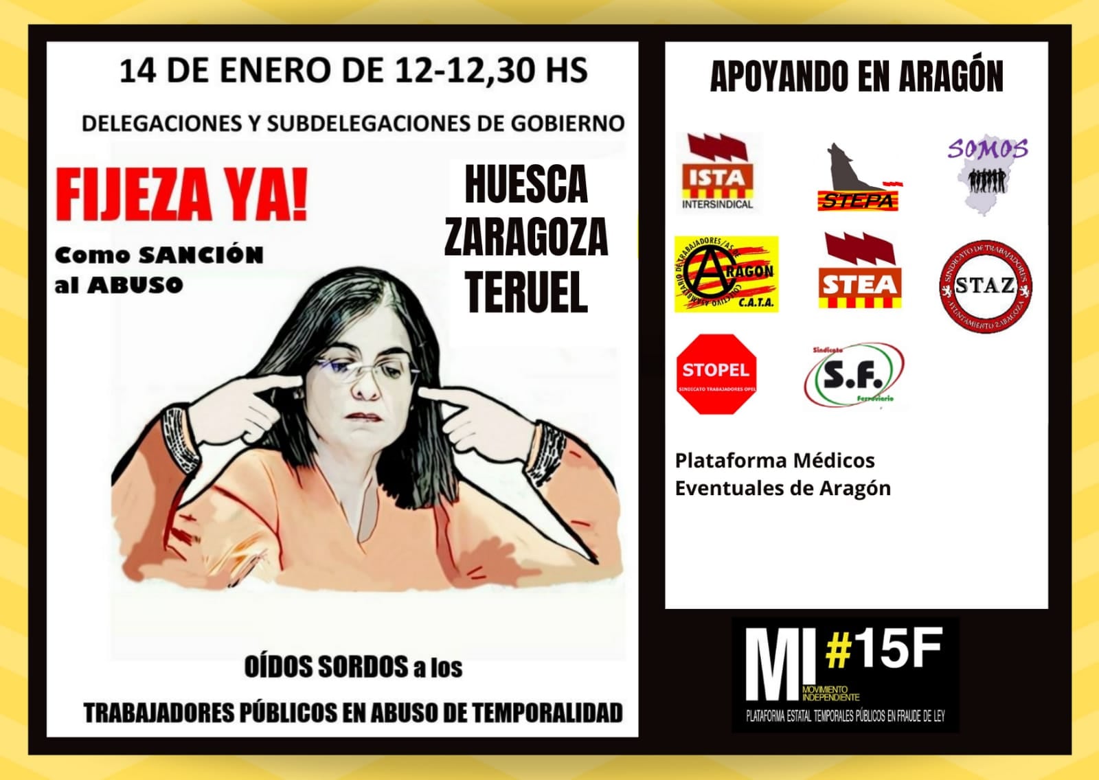 Las movilizaciones, organizadas por el Movimiento #15F en más de 30 capitales de provincia de todo el territorio nacional, aglutinan por primera vez en Aragón el apoyo de diez organizaciones, en representación de la Administración General (STEPA, CATA), Educación (STEA), Universidad (SOMOS), SALUD (Plataforma de Médicos Eventuales de Aragón), Ayuntamiento de Zaragoza (STAZ), Ayuntamiento de Huesca (AYTOSCA), y con el soporte de la Intersindical de Aragón (ISTA).