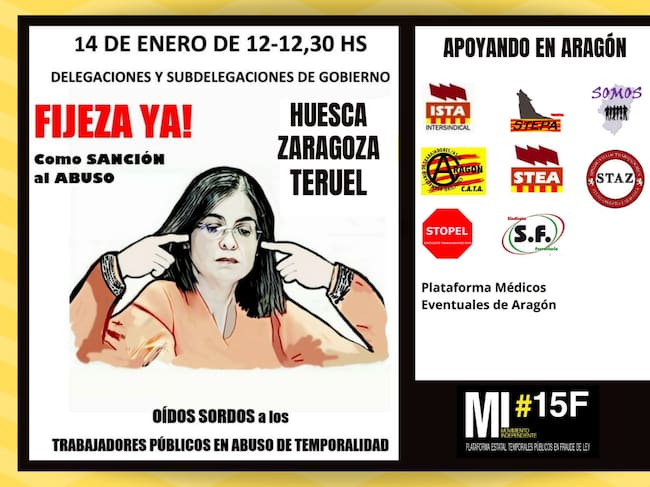 Los representantes de los trabajadores públicos temporales se movilizan de nuevo este jueves en Zaragoza, Huesca y Teruel para denunciar que todas las Administraciones Públicas mantienen niveles de temporalidad que no son permitidos en la empresa privada y siguen sin cumplirse la Directiva Europea y la sentencia del Tribunal de Justicia de la Unión Europea, que obligan a sancionar el fraude de ley de miles de trabajadores que llevan años, y hasta décadas, cubriendo plazas estructurales con contratos temporales. En Huesca la convocatoria es a las 12 de la mañana frente a la Subdelegación del Gobierno.